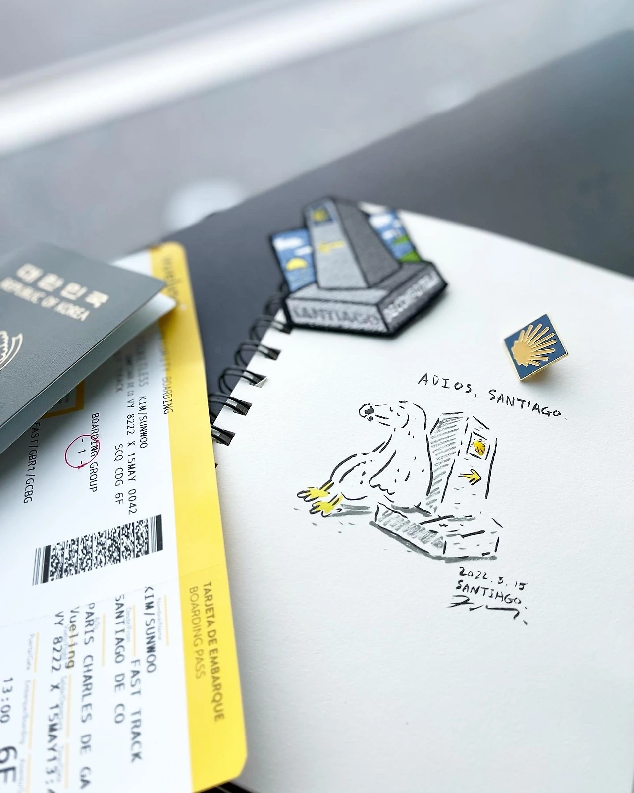 파리로 향하는 비행기 아래로 스쳐가는 지상의 풍경 속에, 길 위의 기억들이 파노라마처럼 흘러갔다. 짙은 연무 같은 안갯속을 깜깜이 헤매며 가방과 머리카락이 흠뻑 젖어가며 피레네를 넘던 날, 하루를 시작하게 하는 고소한 또르띠야와 함께 진한 카페 콘레체를 마시는 일, 연녹빛 나뭇잎과 투명한 햇살이 숲길 위에 만들어내 흔들거리는 수많은 빛의 모자이크 위를 걷는 일, 어느 오래된 동화의 한 장면처럼 민들레 홀씨가 함박눈처럼 흩날리는 꿈결 같았던 그 길, 흐른 땀의 소금기가 눈을 시리게 할 정도로 고된 산행 끝에 불어온 산들바람에 잠시 눈을 감는 일, 아지랑이가 일렁이는 뜨거운 아스팔트 위에 땀방울 자국을 남기며 걷던 중 마시는 콜라, 그루터기에 아무렇게 앉아 신발과 가방을 벗고 지나치는 사람들과 웃으며 안부를 나누는 일, 멀리 보이는 마을의 종탑이 고향처럼 반가웠던 순간, 녹초가 되어 도착한 알베르게의 서늘하고 친숙한 그 공기가 피부에 닿는 감각, 그날의 걷기를 마치고 나른한 오후의 시에스타, 알베르게의 테라스에 비치는 늦은 오후의 부드럽고 포근했던 햇살 속에서 나를 위한 글쓰기와 드로잉을 하는 일, 풀벌레 소리만 나직이 들리는 가운데 새벽 별을 바라보며 홀로 걷는 일, 아무도 없는 깊은 숲 속에서 이유도 모른 채 갓 태어난 아이처럼 철없이 울음을 흘리는 일, 모든 고통을 환희로 잊고 마침내 산티아고에 도착하는 일...