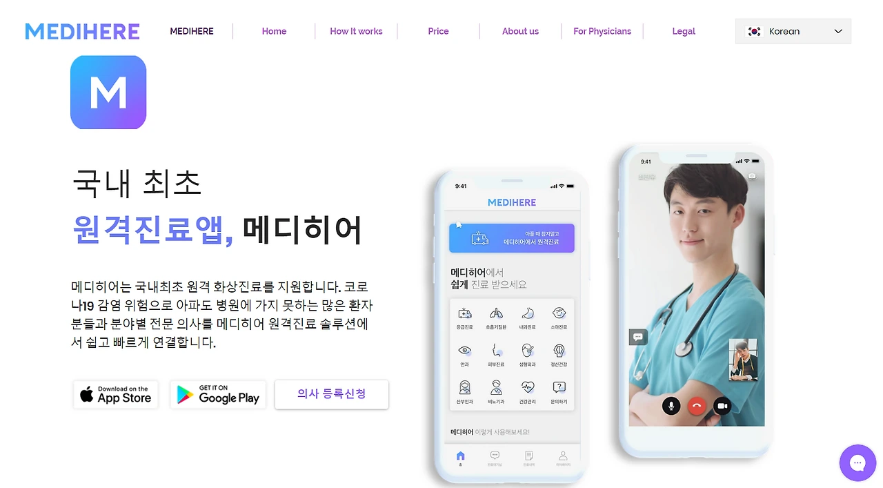메디히어의 경우 원격 화상진료를 지원합니다. 원래 국내에서는 법적으로 원격진료가 불가능해 서비스가 불가능했으나, 이번에 원격진료가 한시적으로 시행됨에 따라 국내 서비스를 한시적으로 제공하기로 한 것으로 알고 있습니다. 다른 앱들과는 달리 원격진료를 초점에 두고 만들어진 앱인 만큼 화상통화를 포함하여, 의료진이 '진료'를 보는데 필요한 여러 요소들이 갖추어져 있습니다.