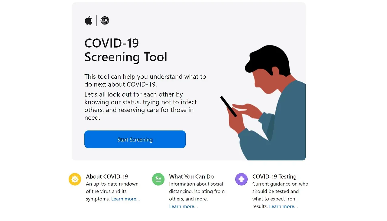 디지털 헬스케어계의 거두인 애플 역시 빠지지 않습니다. 이달 27일, 애플은 코로나19를 선별검사를 위한 웹사이트와 앱을 내놓았습니다. 미국 질병관리본부 (Center for Disease Control, CDC), 백악관 코로나바이러스 대책본부, 그리고 연방재난관리청의 협업으로 만들어진 서비스인데요.
