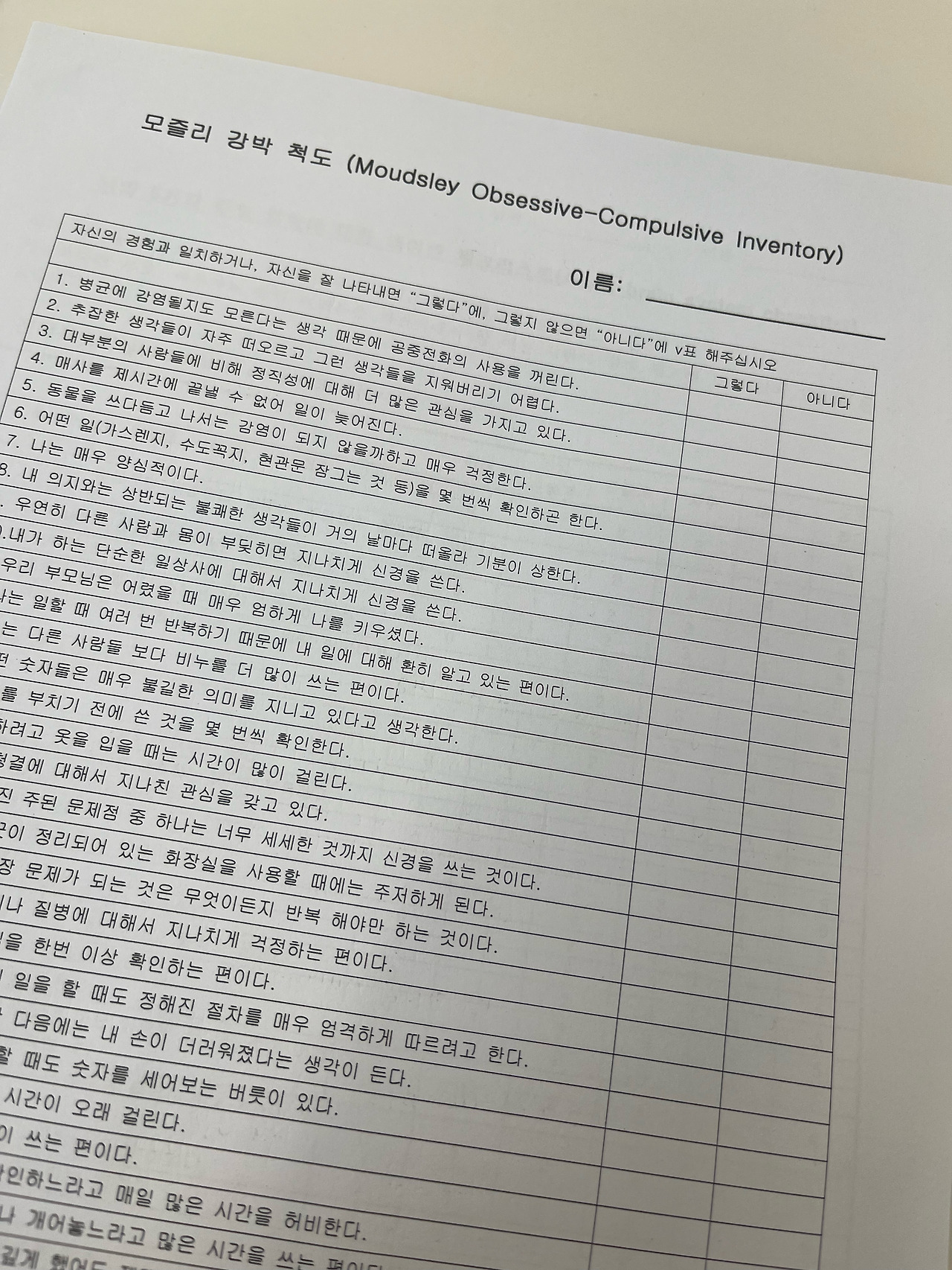 첫 방문 때 받았던 질문지를 작성했다. 벡불안척도, 에이맨브레인체크리스트, 모즐리강박척도, 문장완성검사, 성인애착질문지 등 질문지였고 하나의 테스트는 몇십 혹은 백 개가 넘는 질문으로 이루어져 있었다. 다 작성하는데 두 시간이 넘게 걸렸다.