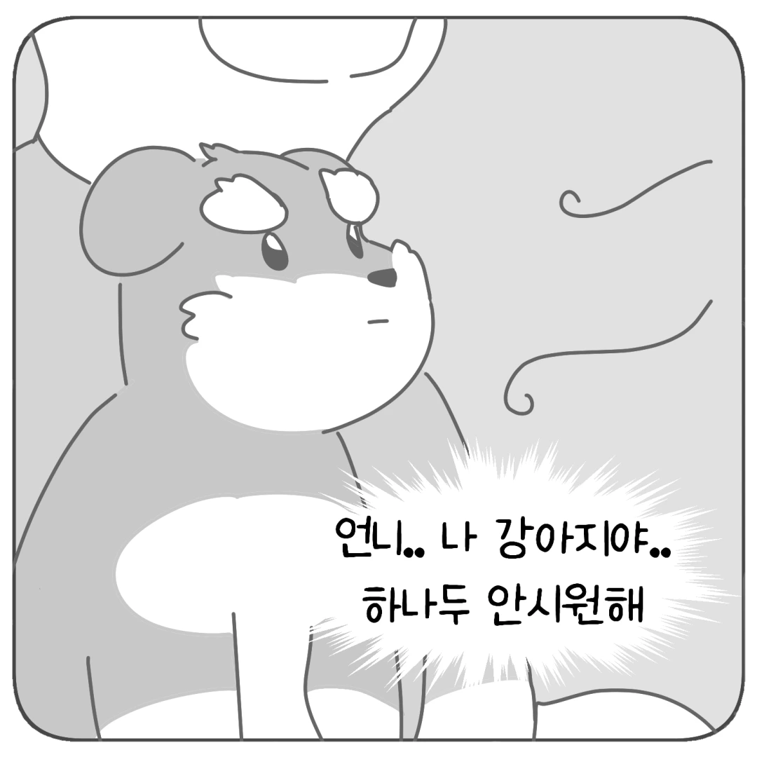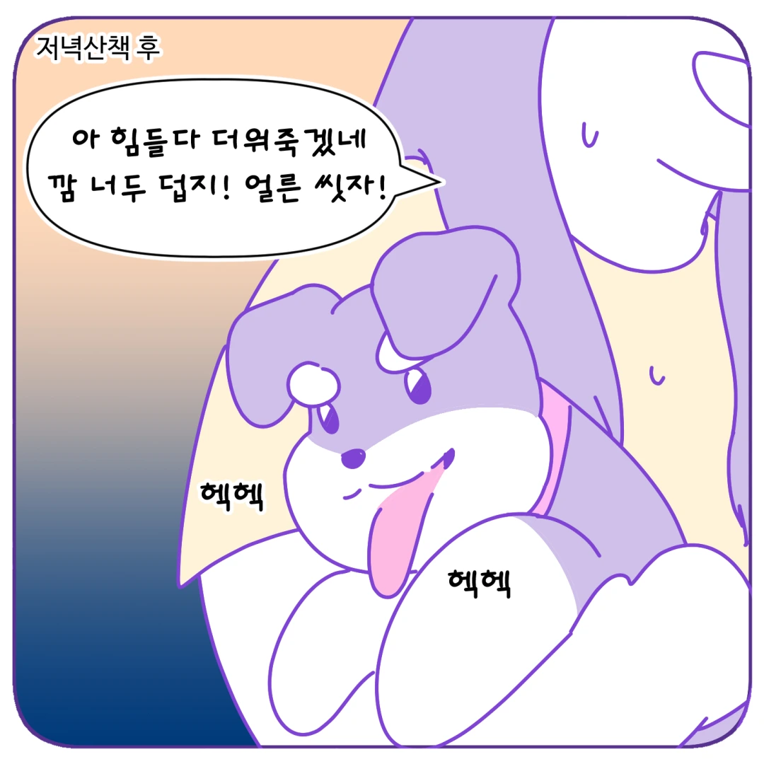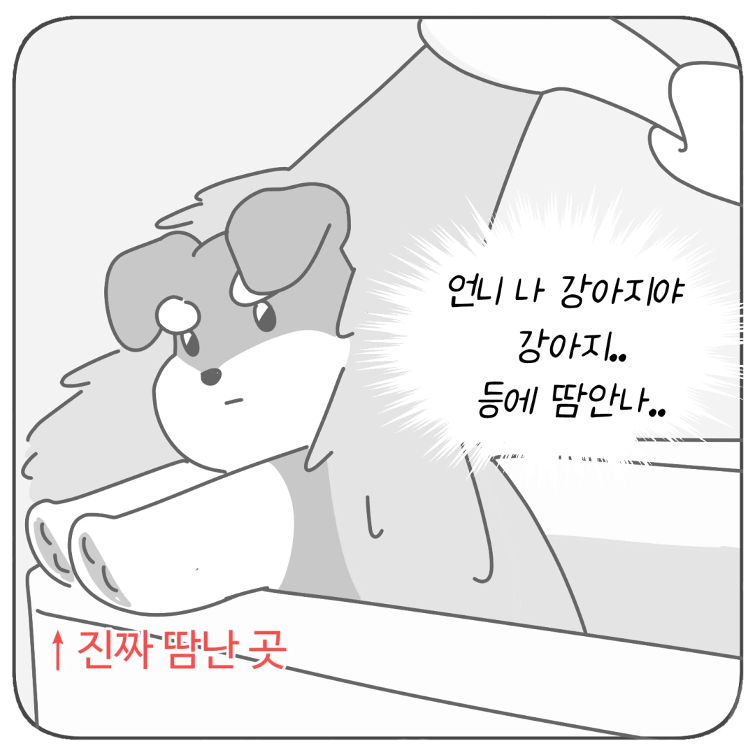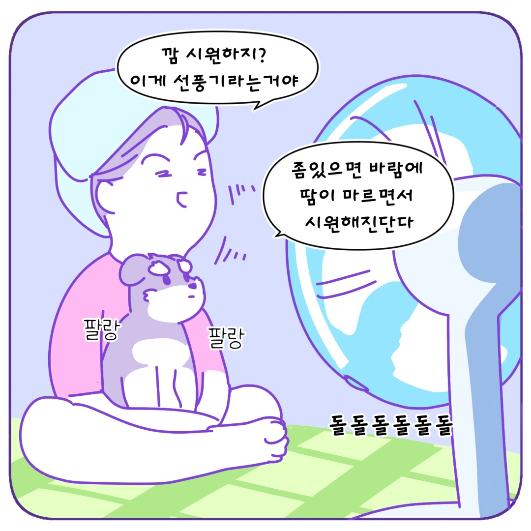강아지에게 선풍기를 틀어주면 효과가 아주 없는 건 아니래요 ㅎㅎ 다만 사람처럼 땀이 증발해서 체온이 내려가는 건 아니라서 만화에 넣어봤어요!