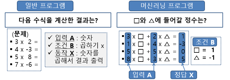 일반적인 컴퓨터 프로그램은 "A 입력에 B 조건이 성립하면 X를 동작시킨다"를 인간이 작성하는 반면, 머신러닝에서는 A라는 정보를 입력할 때 대답이 X가 되는 조건 B를 찾도록 기계를 학습시킨다.( “구글에서 배우는 딥러닝” 닛케이 빅 데이터 著, 서재원 옮김, 영진닷컴, 28p)