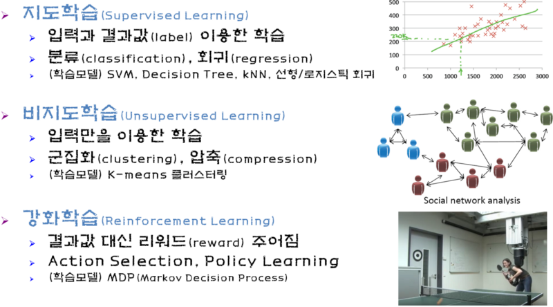 머신러닝은 지도학습, 비지도학습과 강화학습의 세 가지 종류가 있다.