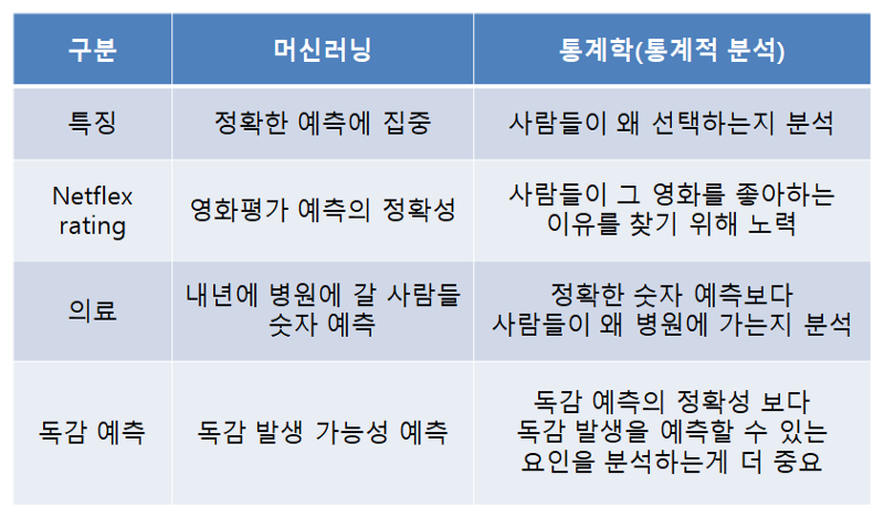 인공지능, 머신러닝, 딥러닝 입문, 김의중 지음, 위키북스(77p, 100p)머신러닝과 통계학은 비슷하지만 차이점이 존재하는데, 머신러닝은 정확한 예측에 집중을 하는 반면 통계학은 사람들이 왜 그러한 선택을 하는지를 분석하는 학문이다.