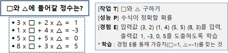 예를 들어, 필기체 문자를 인식하는 경우, 작업 T는 필기체 문자 인식, 성능 P는 필기체 인식의 정확도, 경험 E는 정답이 표시된 필기체 문자의 입력이 될 것이며, 이 경우 정답이 표시된 필기체 문자를 입력하여(경험 E를 통해) 성능 P가 향상된다면 이 프로그램은 학습된다고 할 수 있다.
