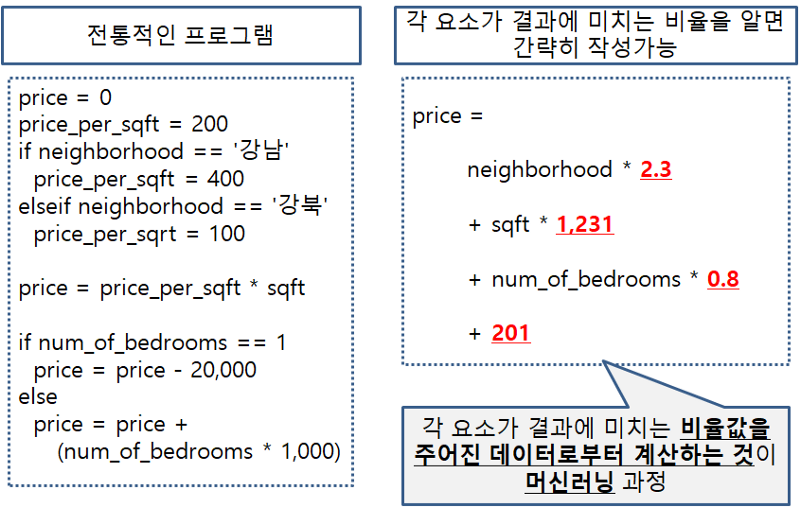 주택가격을 예측하는 프로그램을 작성할 때, 전통적인 프로그래밍과 머신러닝(지도학습 중 선행 회귀regression)를 이용하는 방법을 비교해보자. 아래 왼쪽 전통적인 프로그램을 보면 주택이 위치한 지역에 따라 평당 가격(price_per_sqft)을 다르게 책정하고, 방의 숫자(num_of_bedrooms)에 따라 최종 가격을 적절히 조정하도록 프로그램이 작성되어 있다. 만약 지역, 크기, 방의 숫자 등이 결과에 미치는 비율을 알 수 있다면 아래 오른쪽과 같은 수식을 사용하여 주택가격을 예측할 수 있을 것이다. 머신러닝은 각 요소값과 최종 가격 데이터로부터 각 요소가 결과에 미치는 비율값을 계산할 수 있으며, 머신러닝의 결과값은 각 요소값이 결과에 미치는 비율값(가중치weight)이다.