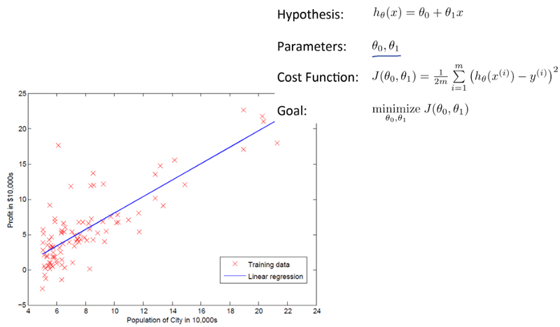 실제 회귀분석을 위한 머신러닝 과정을 살펴보자. 아래는 도시 인구에 따른 푸드 트럭(Food Truck)의 이윤(profit)을 예측하는 선형 회귀분석 문제이다. 비용(Cost Function)이 최저가 되는 파라미터값(세타θ 1, 2)을 찾는 과정이 머신러닝 과정이며, 머신러닝의 결과는 도출된 파라미터값인 세타 1, 2값이다. 이를 예측함수(Hypothesis) h에 적용하면 인구수에 따른 푸드 트럭의 수익 예측치를 구할 수 있다. 즉, 머신러닝 과정은 ① 비용함수(J)가 최저가 되는 예측함수의 파라미터 값(세타θ)을 찾는 단계와 ② 최적의 파라미터 값을 적용한 예측함수를 활용하여 실제 예측값을 구하는 단계의 2단계로 구성된다.
