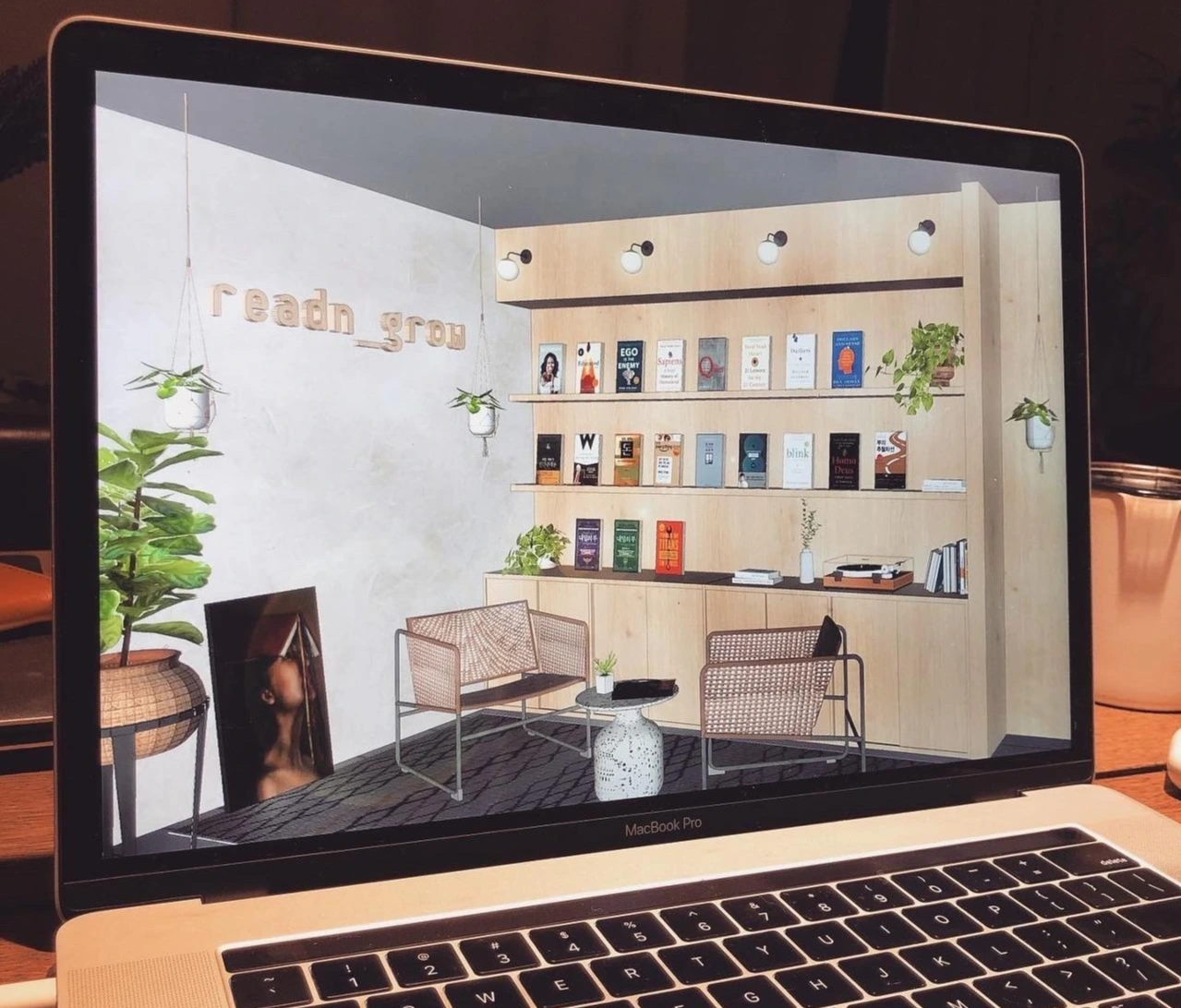 그녀가 영감을 받는 책의 표지가 멋지게 펼쳐져있는 책장,