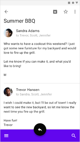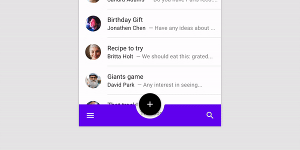 하단 앱 바는 탭과 함께 쓸 수 없기에 대부분 햄버거 버튼을 갖고 있습니다. 그렇기에 하단 앱 바의 활용은 내비게이션 드로어의 활용과 유사합니다.