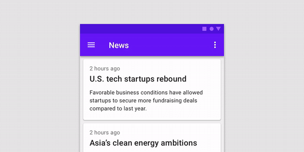 화면을 더 넓게 쓰기 위해 스크롤 시 앱 바를 숨기는 앱이 많습니다. 밑에 있는 컨텐츠를 보기 위해 화면을 아래로 스크롤 할 때, 상단 앱 바는 컨텐츠와 같이 위로 올라가면서 사라집니다. 반대로 스크롤 할 때 다시 내려오구요. 화면과 같이 앱 바가 움직이기에 자연스럽습니다.
