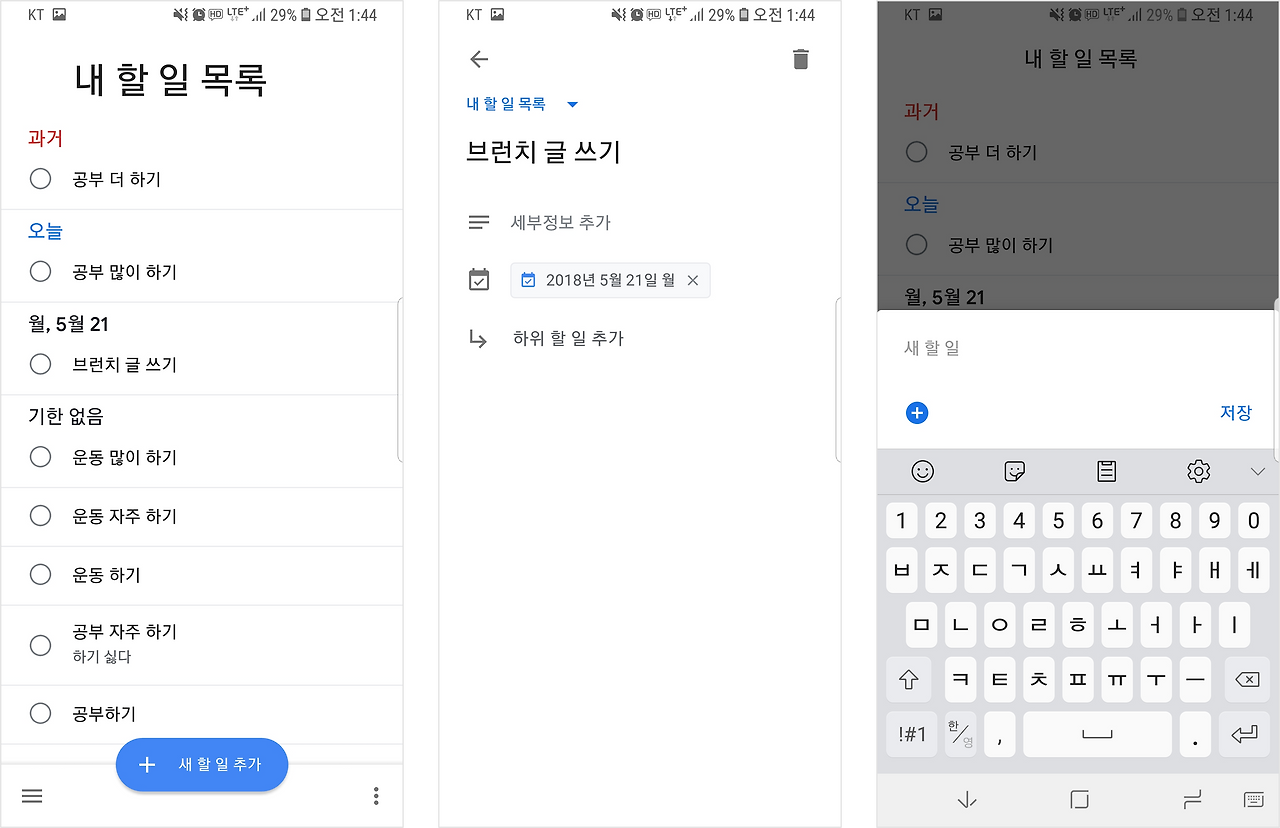 구글도 이 점에 대해 많이 고민을 했는지 하단 앱 바에 정말 잘 어울리는 Google Tasks라는 앱을 만들었습니다. 기능은 간단합니다. 할 일을 추가하고, 다 했으면 체크하는 게 전부입니다. 화면도 목록이 나온 메인 화면, 세부정보 화면, 새 할 일을 추가하는 모달이 사실상 전부입니다. 핵심 기능이 명확하고(새 할 일 추가, 한 일 체크) 다른 메뉴로 접근할 일이 별로 없습니다. 그리고 메뉴가 유동적이어서(새 목록을 만들거나 삭제 가능) 탭으로 표현하기에는 적합하지 않죠.