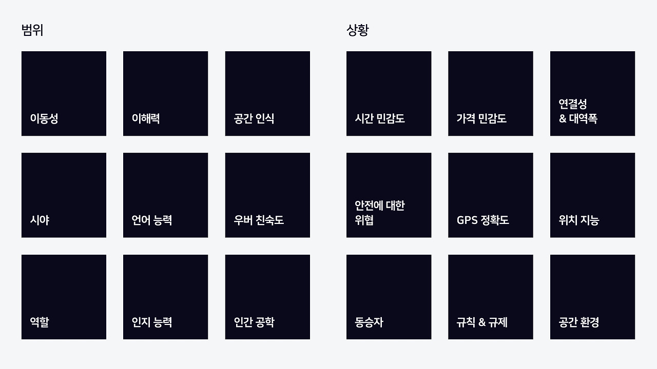 범위는 사용자가 우버와 인터랙션 할 때 고려해야 할 일시적 또는 영구적 어려움의 영역에 중점을 두고자 했다.