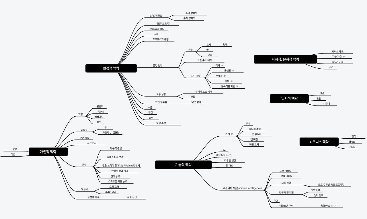 우선 탑승자와 운전자의 경험에 영향을 미치는 다양한 요인들을 이해하는 것이 중요했다. 나는 관련된 모든 사항들을 관계도로 그리고, 범위와 상황(spectrums and situations) 프레임워크로 변환시켰다.