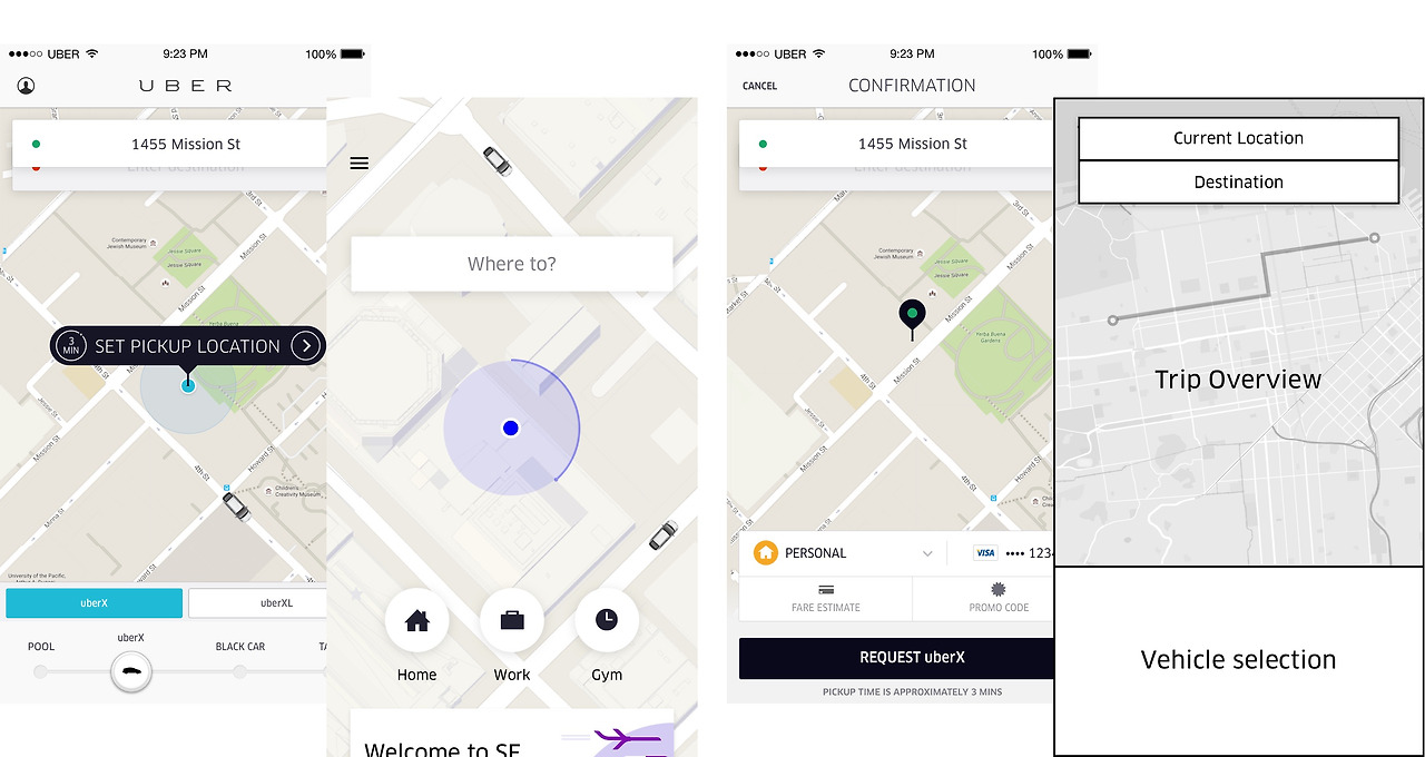 나는 앱의 메인 플로우 동안 픽업 위치를 보여주지 않는다는 리스크가 큰 결정을 내렸다. 여정이 어떻게 진행될지를 전반적으로 보여주어, 어디서 픽업될지 보다는 (픽업은 우버에서 관리하고 있으므로) 어떻게 목적지에 갈지 선택하는 데 탑승자를 집중시키려는 것이었다.