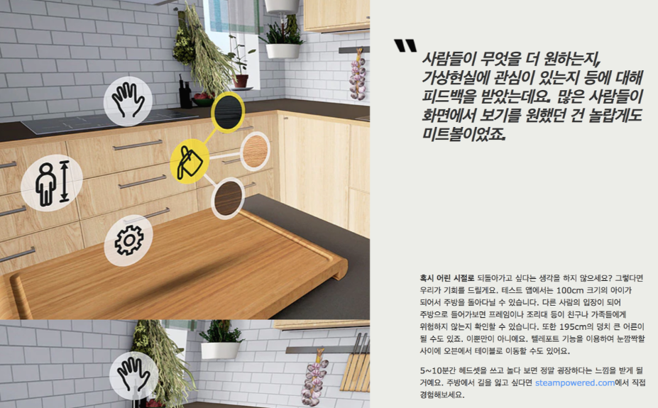 아직까지는 몰입 경험의 기술이 상용화 될 수 있을 만큼 비용이 저렴하지 않기 때문인지, 대기업을 중심으로 몰입 기술이 마케팅 등에 활용되고 있는데요, 그 예로 VR 기술을 마케팅에 빠르게 활용하고 있는 IKEA 의 사례가 있습니다.