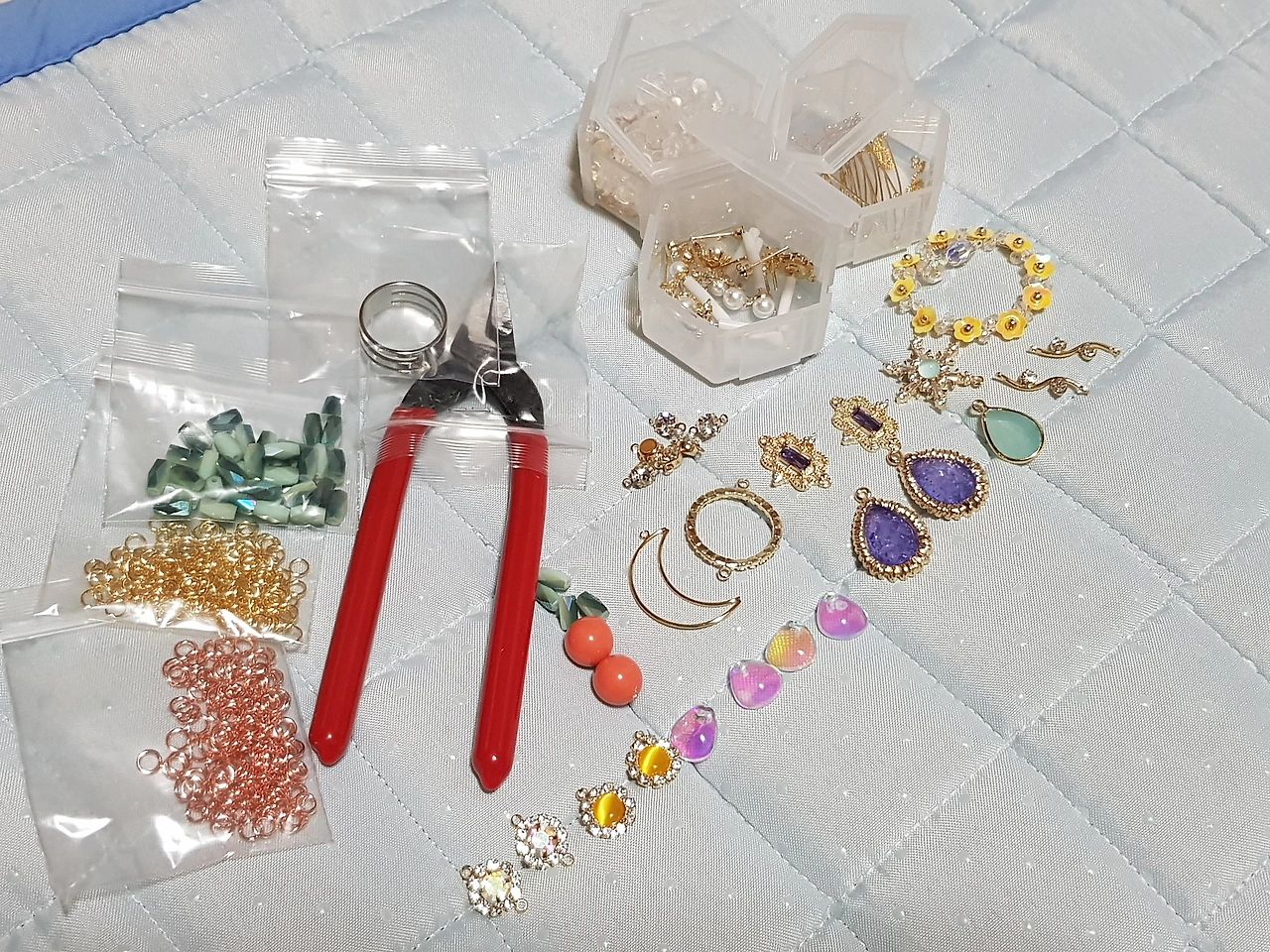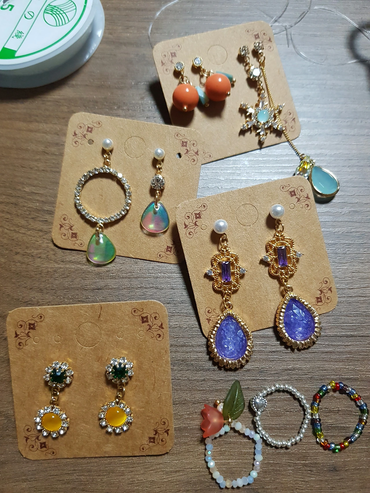 다녀와서 풀어보니 나도 모르게 이렇게 많은 재료를 영입하고 말았다. 한동안 취미회가 없는 날에도 집에서 부스럭부스럭 열심히 만들었던 추억이 있다. 순식간에 너무 귀걸이가 많아져서 감당이 안될 정도라 몇 개는 선물을 하기도 하고, 판매도 고려했는데 막상 실행은 하지 못했다. 그래도 언젠가 N잡으로 써먹을 수 있으면 좋겠다고 생각하는 유력한 아이템 중 하나로 남았다.