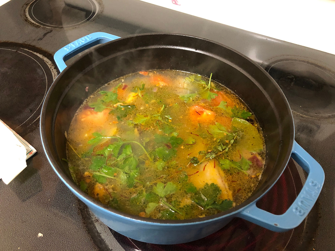 정석 레시피를 내 마음대로 살짝 바꿔본 레시피. 사실 생선 수프 (soupe de poisson)을 참고해 만든 레시피이지만 결과물은 부야베스와 매우 비슷하다. 둘의 차이는 soupe de poisson은 생선 뼈/머리 와 모든 재료를 넣어 끓인 후 건더기를 채로 걸러 내는데, 부야베스는 그 걸러 낸 국물에 생선 필레를 마지막에 20분 정도에 넣는 레시피다. 그럼 생선 맛도 살리면서 생선의 부드러움도 유지할 수 있겠지? 나는 생선 국물 낼 거리가 없어 바로 생선 필레를 쓰는 바람에 필레를 꽤 오래 끓였다.
