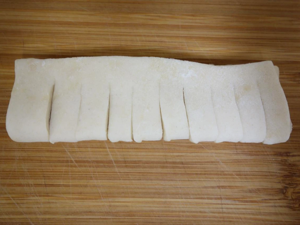 6. 반죽에 밀가루를 솔솔 뿌려준 다음 가장자리에 1cm가량의 여유를 두고 칼집을 낸다. 칼집 사이의 넓이도 1cm 정도면 적당하다.