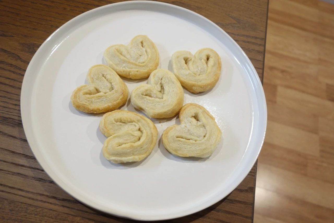줄리아 차일드의 요리책을 좋아하는 이유 중 하나는 남은 재료를 활용하는 방법까지 야무지게 소개해준다는 점이다. 남은 페이스트리 반죽으로 만들 수 있는 레시피도 꽤 여럿 되는데, 이번에는 종려 잎 또는 하트 모양의 쿠키 'Palmiers (팔미예)'를 만들어보았다. 반죽을 직사각형으로 잘라 가운데를 기준으로 반반 접어 설탕 솔솔 뿌린 다음 1cm 두께로 썰어 오븐에 30분간 구우면 된다. 프렌치 퍼프 페이스트리는 낯을 많이 가리는 친구 같은 레시피다. 처음 친해지는 게 (반죽 만들기가) 굉장히 오래 걸려서 그렇지, 그다음부터는 일사천리로 다양한 메뉴를 만들어낼 수 있다. 그래서 더더욱 첫 단추를 잘 끼워야 한다. 반죽을 제대로 만들어둬야 그다음 메뉴도 줄줄이 성공할 수 있는 것이다.