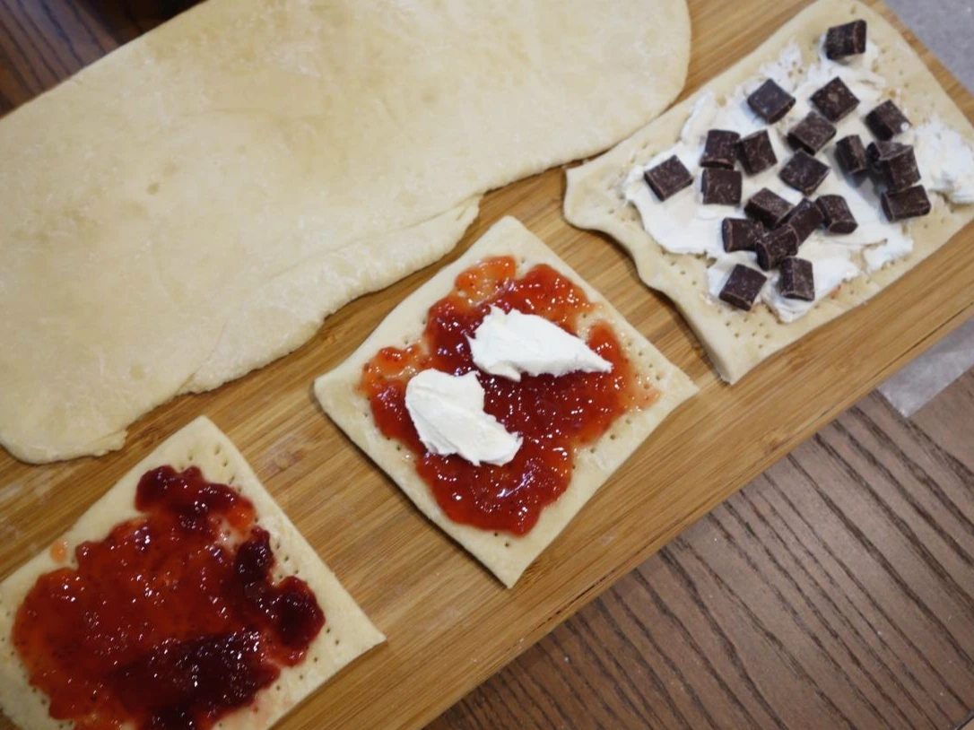3. 반죽 가장자리에 약간의 여유를 두고 파이 속을 0.5cm 두께로 올린다. 나는 라즈베리 잼, 딸기잼, 크림치즈, 다크 초콜릿을 이리저리 조합해보았다. 워낙 버터향 가득하고 헤비한 반죽인지라 파이 속은 상큼한 과일 잼으로 채우고 싶었다.
