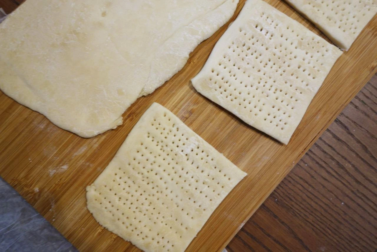 2. 잘라놓은 페이스트리 반죽에 포크로 구멍을 뽕뽕 뚫는다.