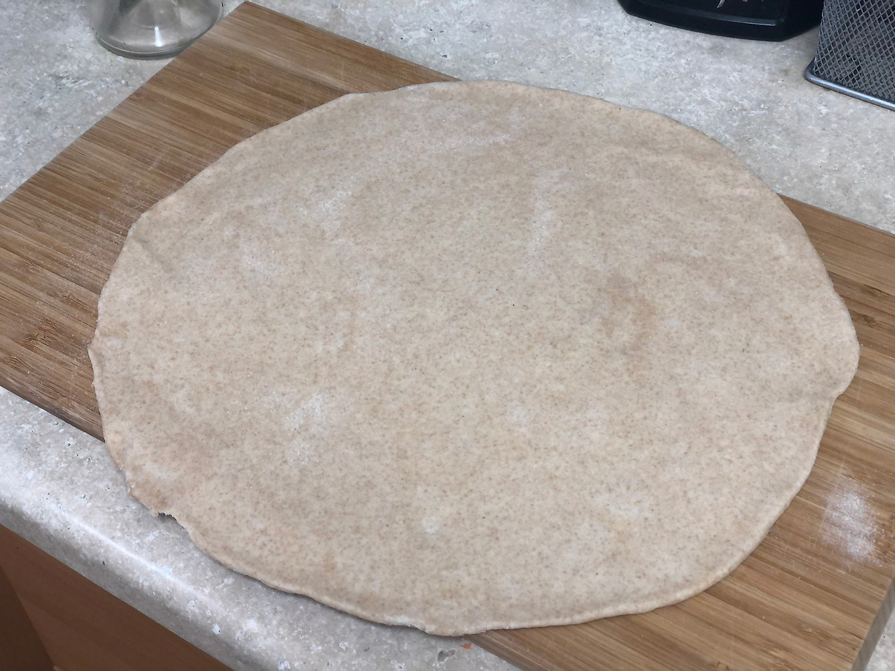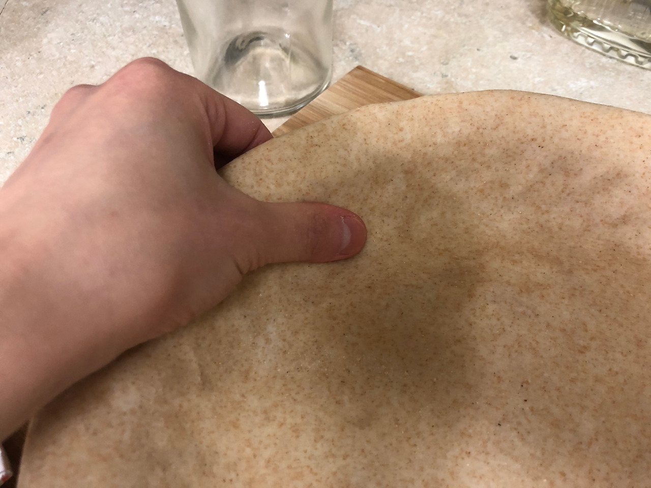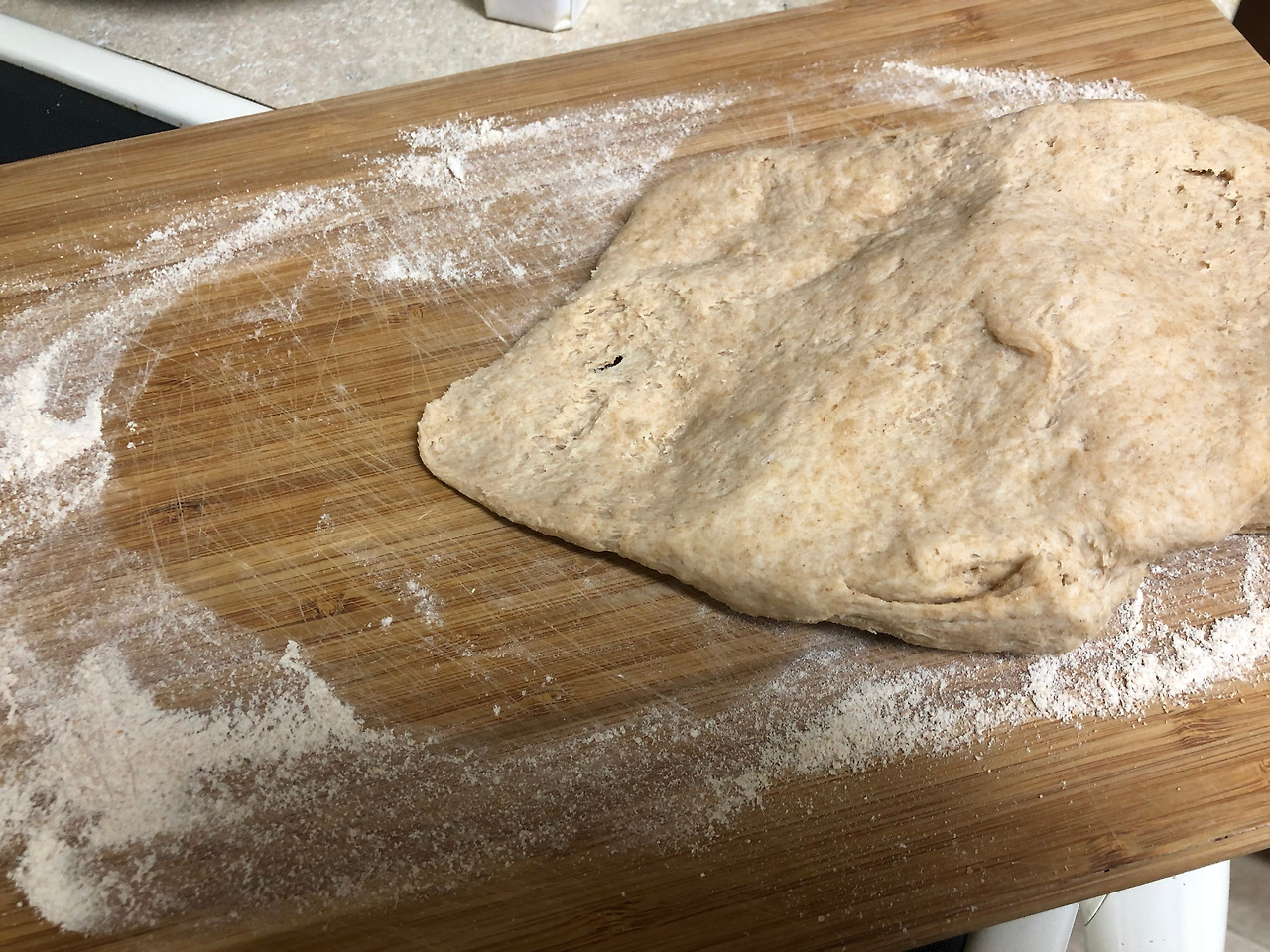 3. 반죽을 공 모양으로 만든다. 이때 반죽은 말랑하되 진득하지 않은 상태여야 한다. 매사추세츠주 내에 코로나 바이러스 상황이 심각해지면서, 일반 밀가루가 동이 나버려 그나마 남아있던 통밀가루를 샀더니 반죽 색깔이 아주 건강하다.