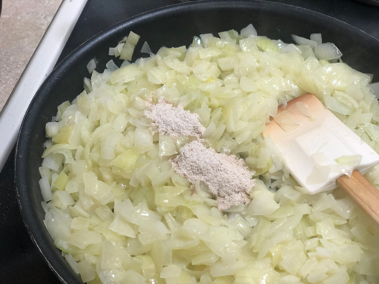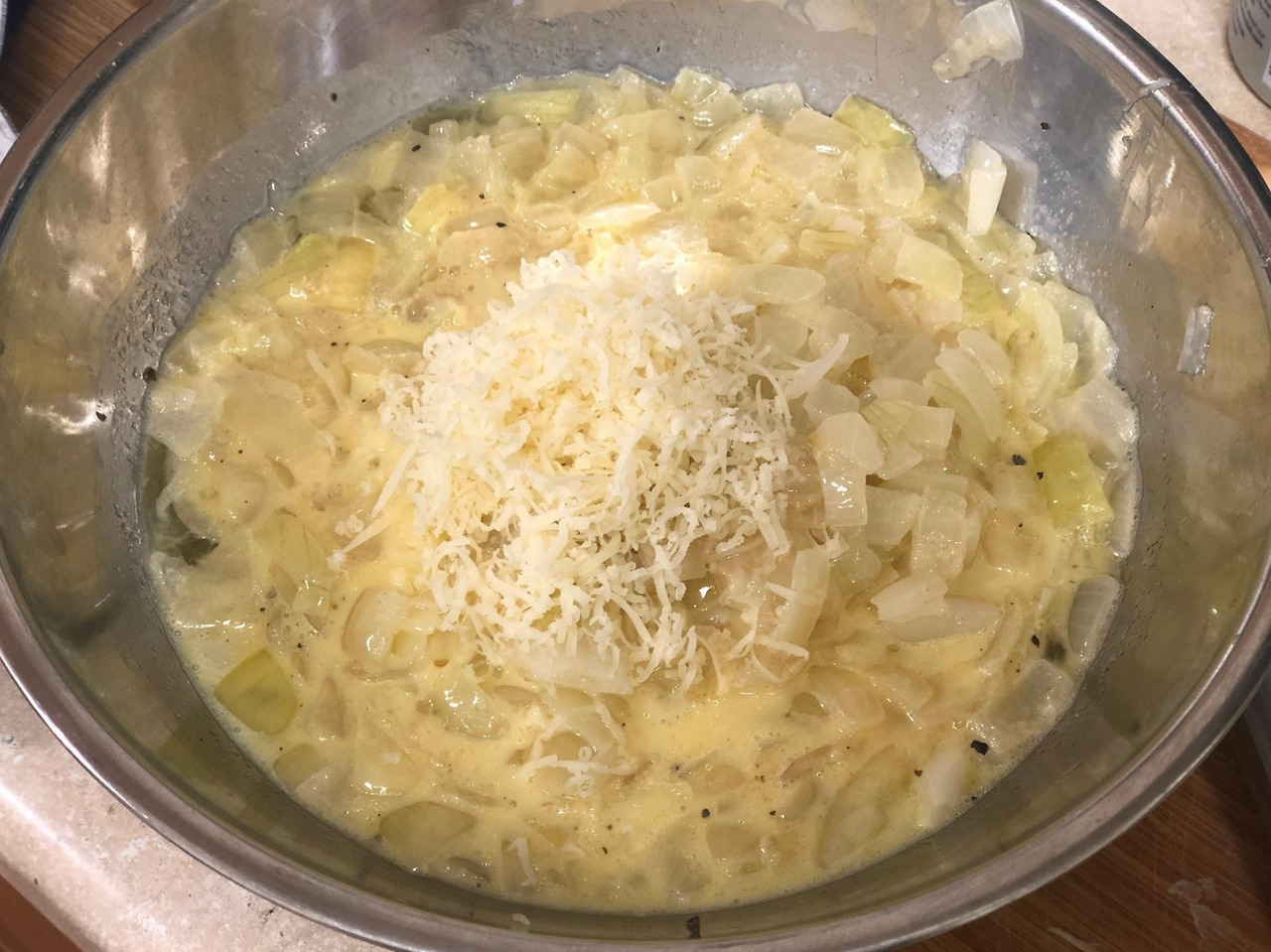 15. 스위스 치즈 갈아둔 것 중 절반 가량과 볶아둔 양파를 넣고 섞는다. 이때 기호에 따라 간을 맞춰둔다.