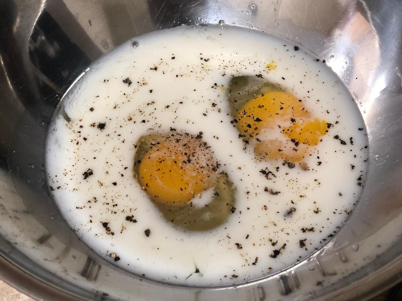 14. 보울에 달걀, 우유, 소금, 후추를 넣고 골고루 섞는다.