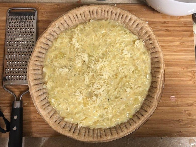 필링: 잘게 썬 양파 7컵, 버터 3Tb, 오일 1Tb, 밀가루 1.5Tb, 달걀 2개, 우유 (or 휘핑크림) 2/3컵, 소금 1 tsp, 후추 1/8 tsp, 스위스 치즈 1/2 컵, 버터 약간 (생략)