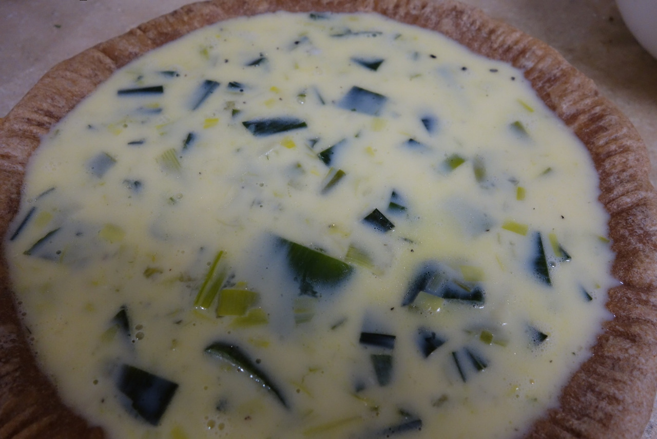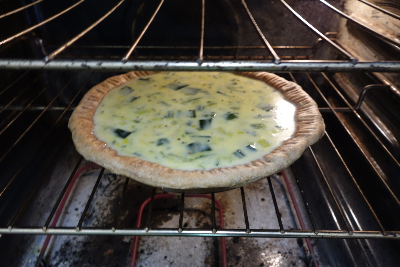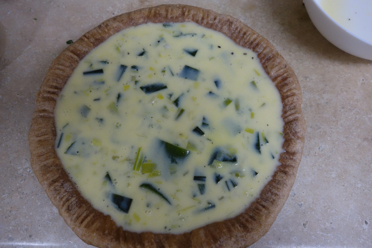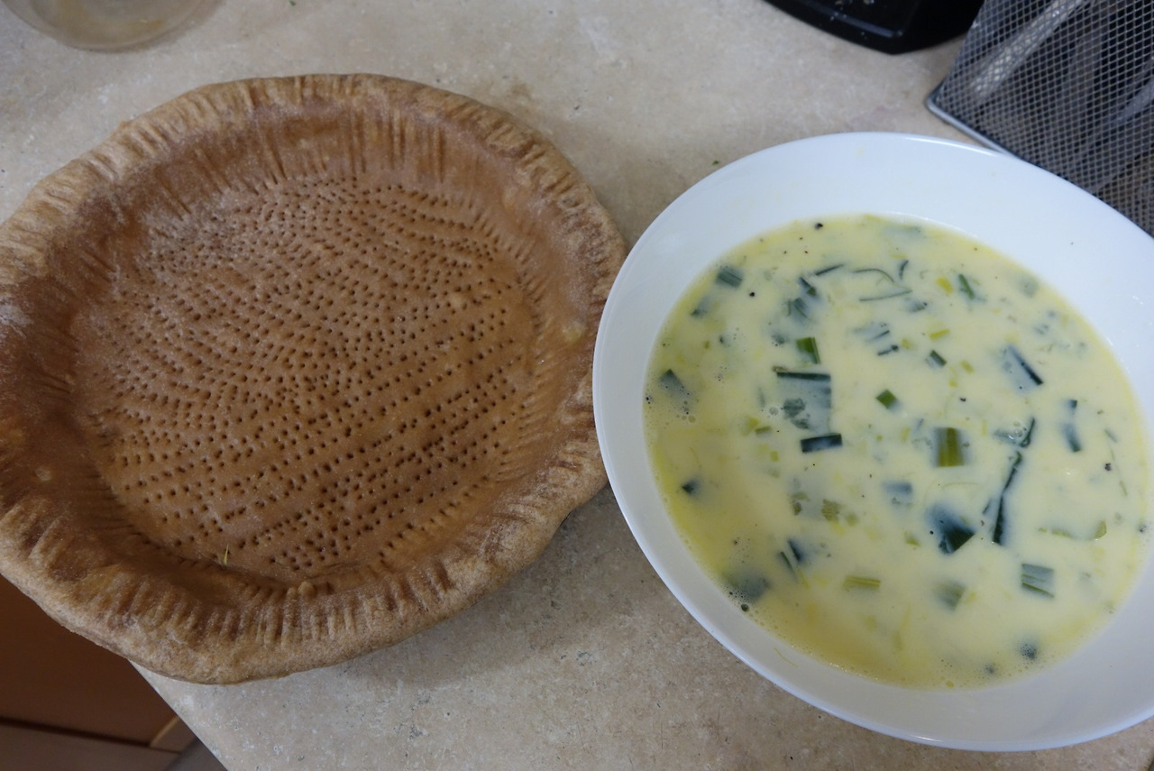 필링: 잘게 썬 대파 (흰 부분을 추천했으나 그냥 초록 부분도 씀) 5컵 정도, 버터 3Tb, 오일 1Tb, 밀가루 1.5Tb, 달걀 2개, 우유 (or 휘핑크림) 2/3컵, 소금 1 tsp, 후추 1/8 tsp, 스위스 치즈 1/2 컵, 버터 약간 (생략)