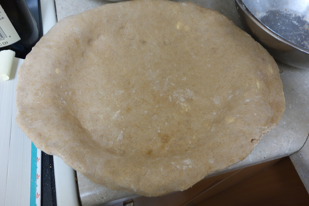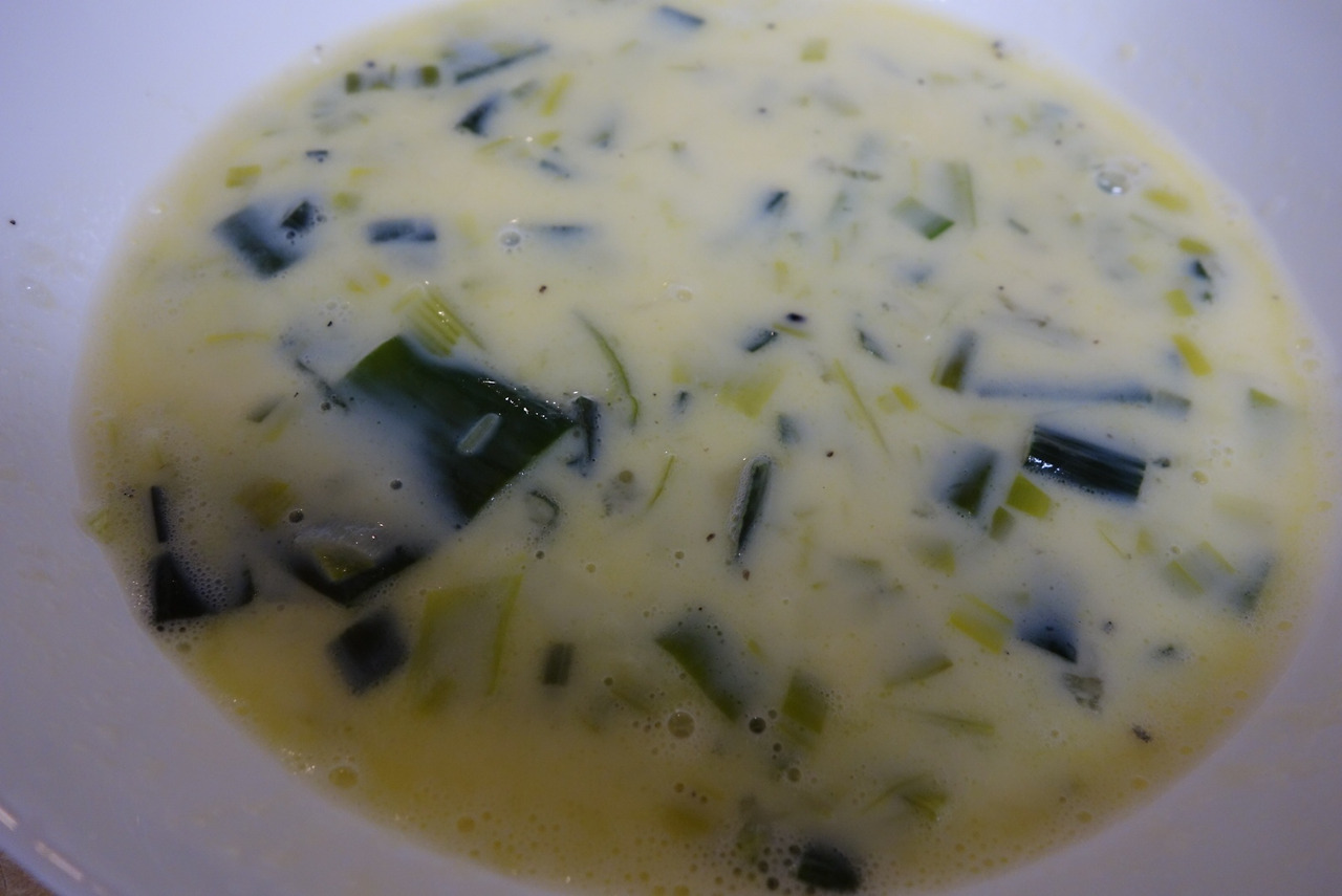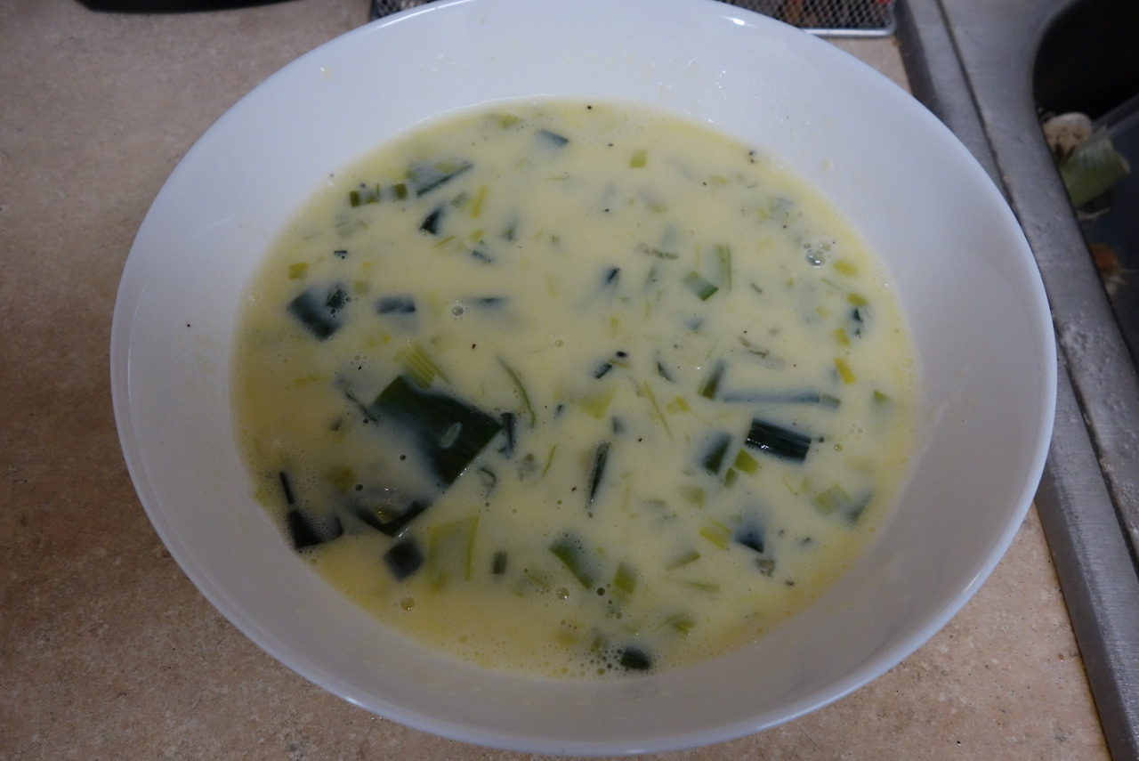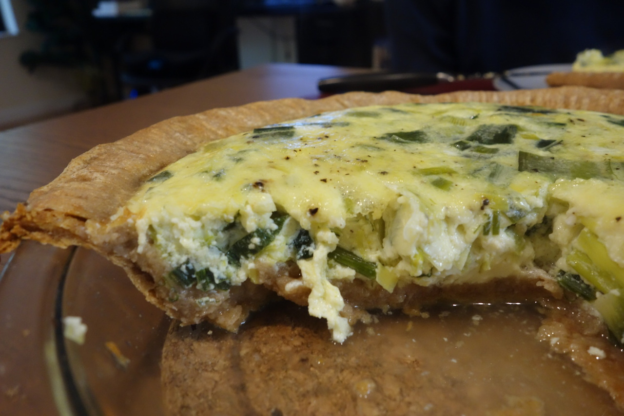 필링: 잘게 썬 대파 (흰 부분을 추천했으나 그냥 초록 부분도 씀) 5컵 정도, 버터 3Tb, 오일 1Tb, 밀가루 1.5Tb, 달걀 2개, 우유 (or 휘핑크림) 2/3컵, 소금 1 tsp, 후추 1/8 tsp, 스위스 치즈 1/2 컵, 버터 약간 (생략)