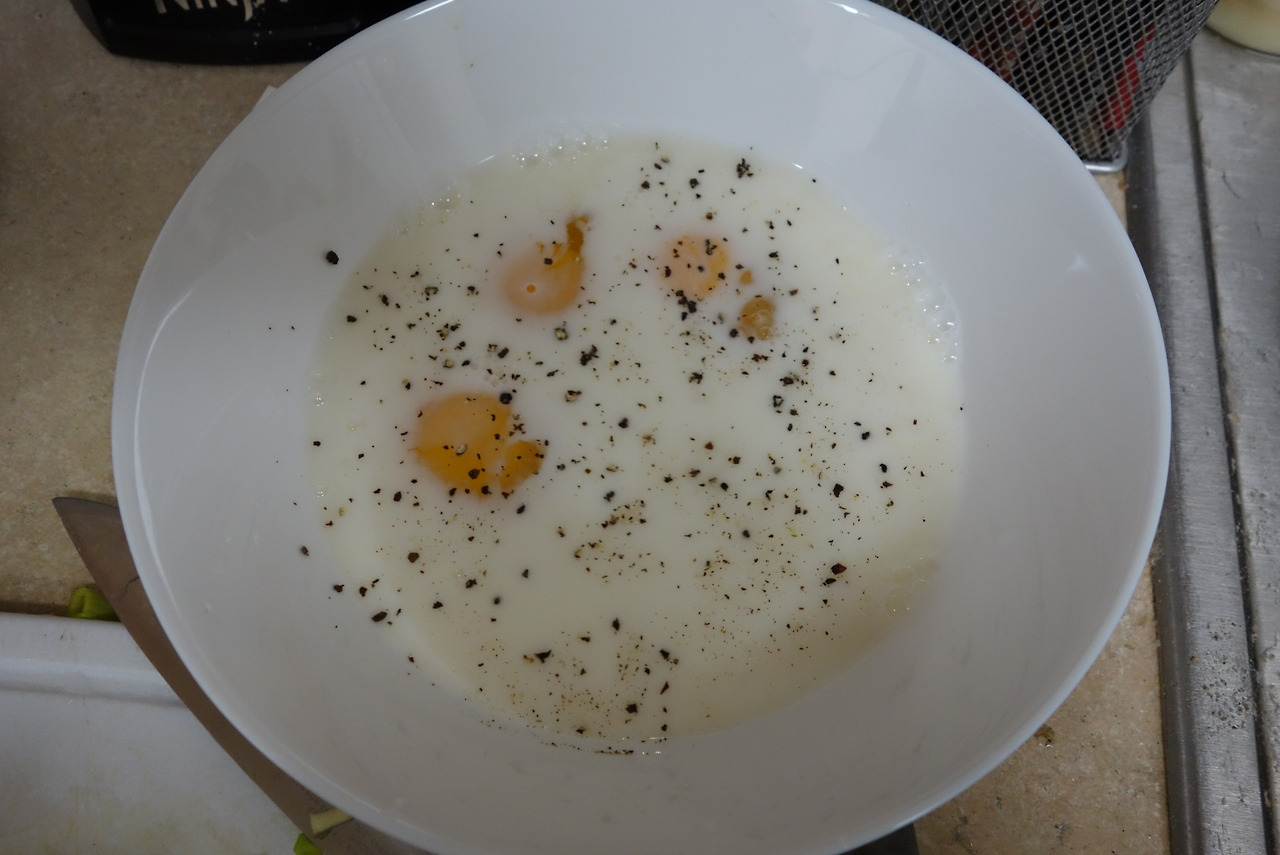 우유 (혹은 휘핑크림)과 계란, 소금 후추를 잘 섞어 준다. 우리 집은 크림 안 먹으니까 우유로 대체한다. 우유 대신 크림으로 만들면 좀 더 단단한 질감의 키쉬가 되지 않을까 생각한다.