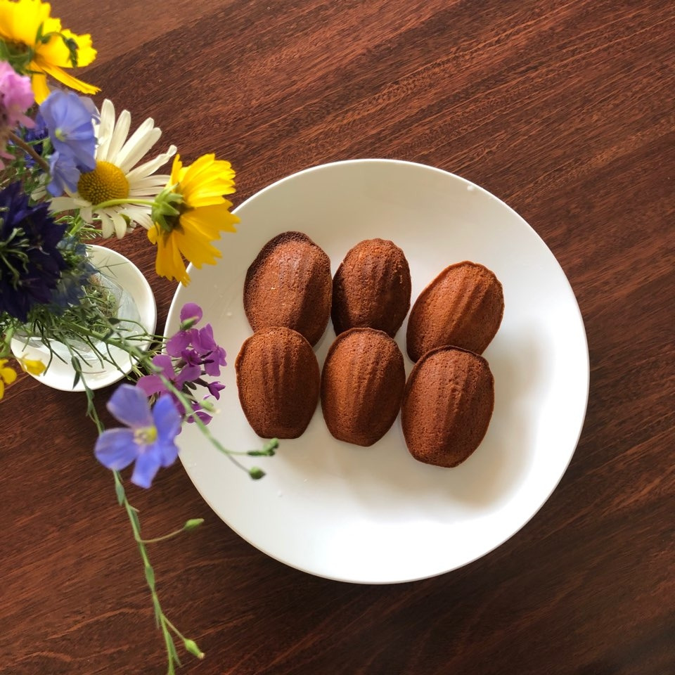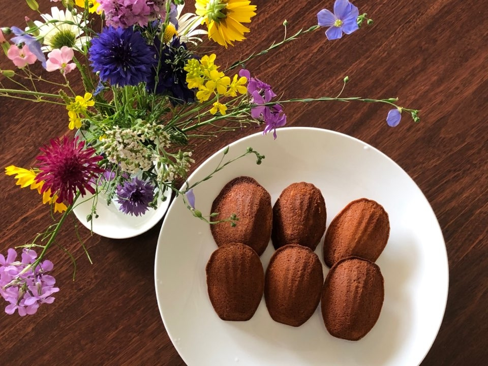 정원에 살랑살랑 피어있던 꽃 몇 송이를 실내로 데려왔다. 요즘 부모님 댁에서 머무르고 있는데, 정원 가꾸기를 좋아하시는 부모님 덕분에 아주 다양한 꽃들의 향연을 덩달아 즐기고 있다. 장미와 양귀비처럼 강렬한 색깔과 모양으로 자기주장이 강한 꽃들도 아름답지만, 웬일인지 늘 배경처럼 조용히 피어있는 파스텔톤의 작은 꽃들에 눈길이 더 오래 머무른다. 소박한 재료로 후다닥 구워낸 허니 마들렌이 소소한 그날의 꽃꽂이와 꽤나 잘 어울렸다.