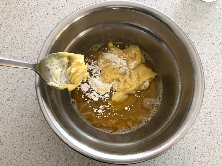 5. 밀가루 (박력분 or 중력분), 베이킹파우더, 녹여두었던 버터를 반죽에 추가하여 골고루 섞는다.