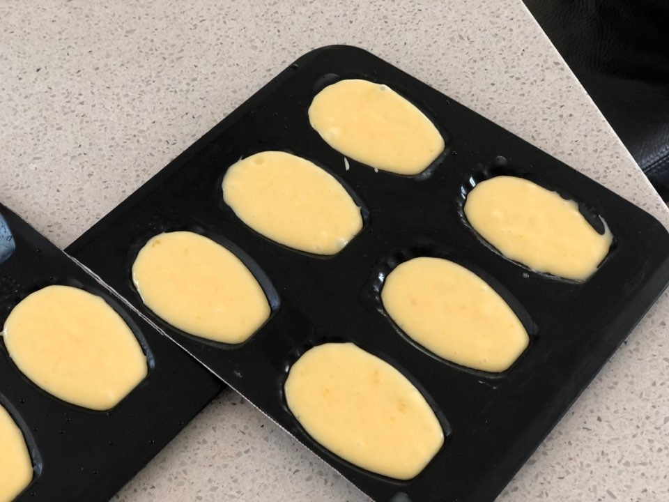 7. 차게 식혀둔 마들렌 틀을 꺼내여 반죽을 담는다. 조개 모양 1구당 80% 정도의 양만 담아주는 것을 추천한다. 나는 틀이 비어있는 꼴을 차마 보지 못하고 반죽을 가득 채워버렸다.