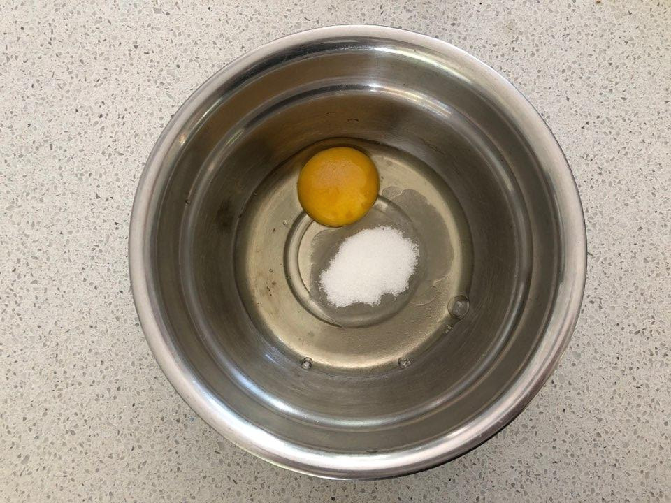 3. 보울에 설탕과 소금, 계란을 넣고 골고루 섞는다. 설탕이 녹아 보이지 않을 때까지. 설탕 양은 기호에 따라 조절한다. 베이커리나 카페에서 주로 구할 수 있는 마들렌의 맛을 선호한다면 위에 써둔 설탕 양을 야무지게 다 넣으면 된다. 개인적으로는 너무 달콤한 디저트보다는 살짝 단맛이 도는 정도를 선호하기 때문에 반죽에 들어가는 설탕의 양은 절반 정도로 줄였다. 좋게 말하면 건강한 취향, 사실대로 말하면 할매 입맛.