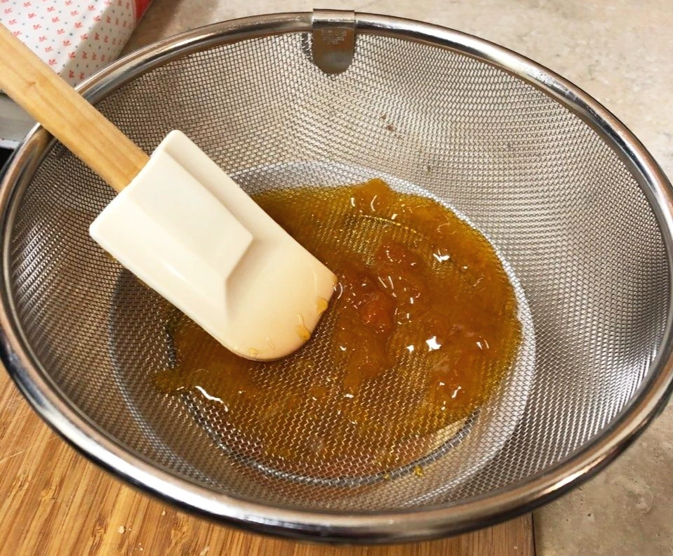 12. 살구잼을 약불에 익혀 녹인 후, 체로 거른다. 잼만 따로 먹을 때는 인지하지 못했는데 살구 껍질이 꽤 많이 걸러진다.
