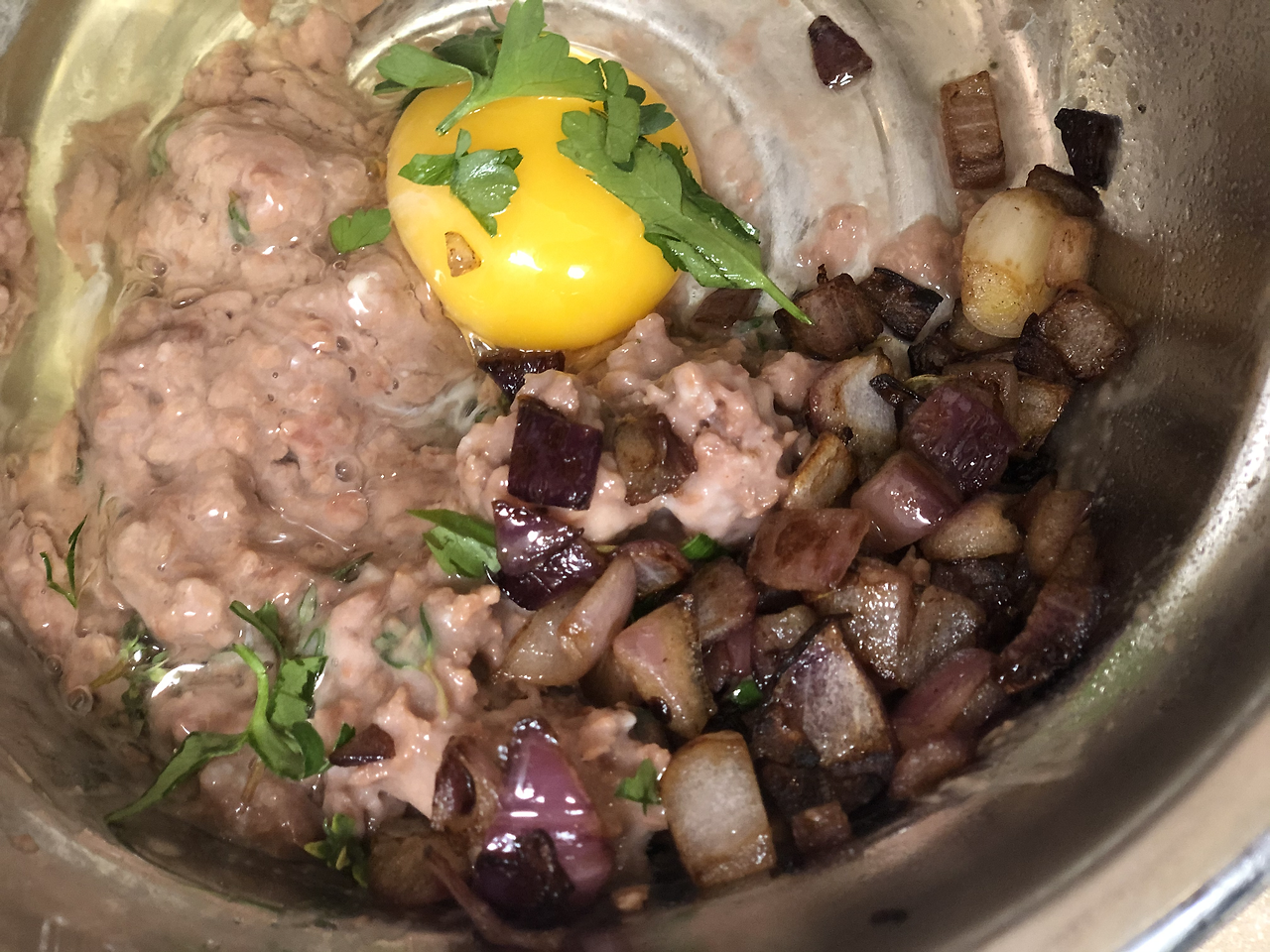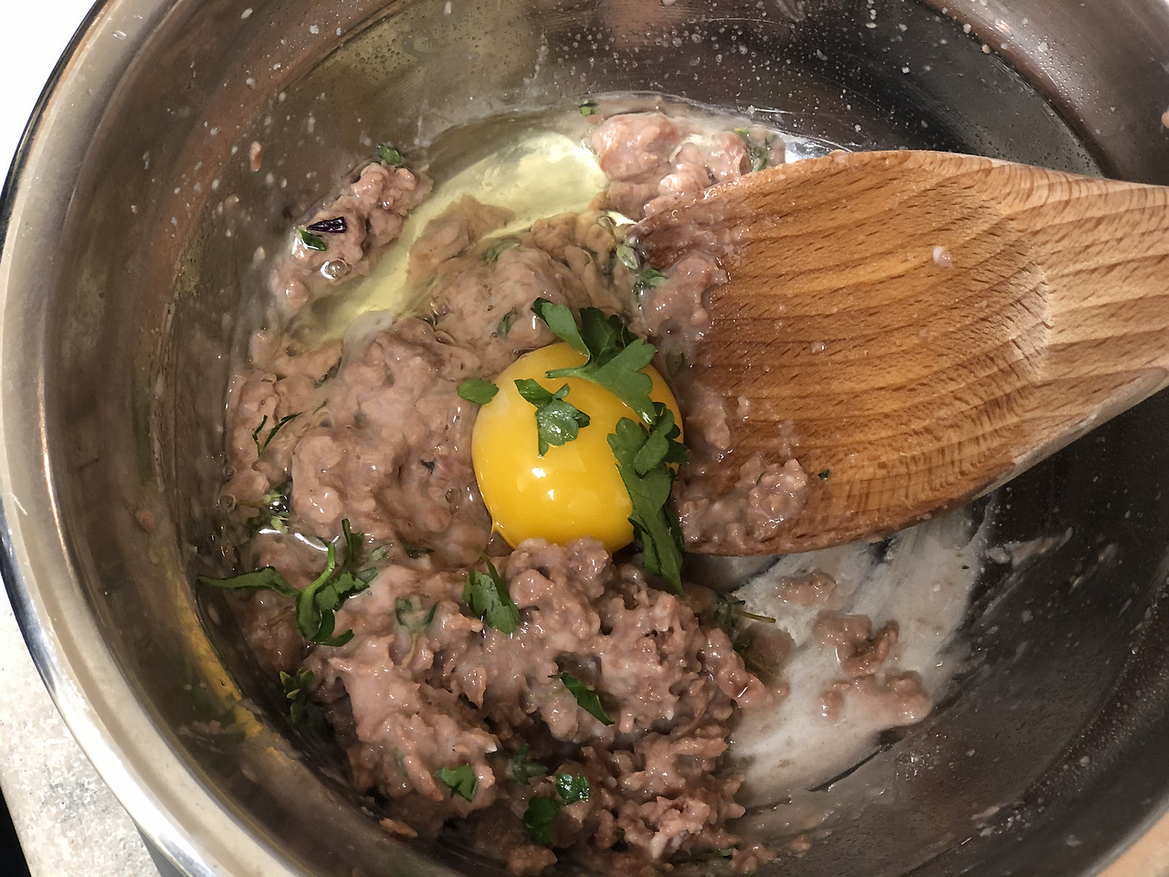 2. 다진 소고기 200-300그람 정도와 계란 한 개, 살짝 녹인 버터 반 스푼, 소금, 후추, 그리고 타임을 넣고 신나게 섞는다.