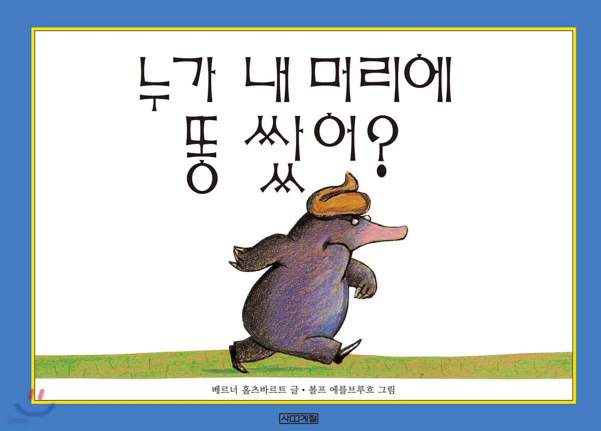 오늘은 1학년 교실에서 담임 선생님께서 그림책을 읽어주셨다. 그림책을 사랑하고 그림책의 가치와 효용을 몸소 체득하고 있는 선생님이 읽어주신 책은 많은 이가 읽어보았고 알 만한 <누가 내 머리에 똥 쌌어?>라는 그림책이다. 여기저기서 나, 저 책 읽어봤는데 하는 아이들의 소리가 들린다. 나도 그 표지를 모를 리가 없다. 읽었는지, 혹은 읽었음에도 기억하지 못하는지, 어쨌든 오늘은 담임 선생님의 그림책 읽기에 나도 집중했다. 두더지 한 마리가 땅에서 나오는 찰라 누가 머리에 소시지 같은 똥을 누고 간다. 속상하고 화가 난 두더지가 "니가 내 머리에 똥 쌌어?" 하며 만나는 동물마다에게 묻는다. 동물들은 내가 아니야, 내 똥은 이렇게 생겼어, 하며 직접 배설하여 생김새가 다름을 보여준다. 마침내 파리를 만나 범인이 개라는 것을 알고는 콩알만한 자신의 똥을 개의 머리 위에 싸면서 후련하게 복수는 끝난다.
