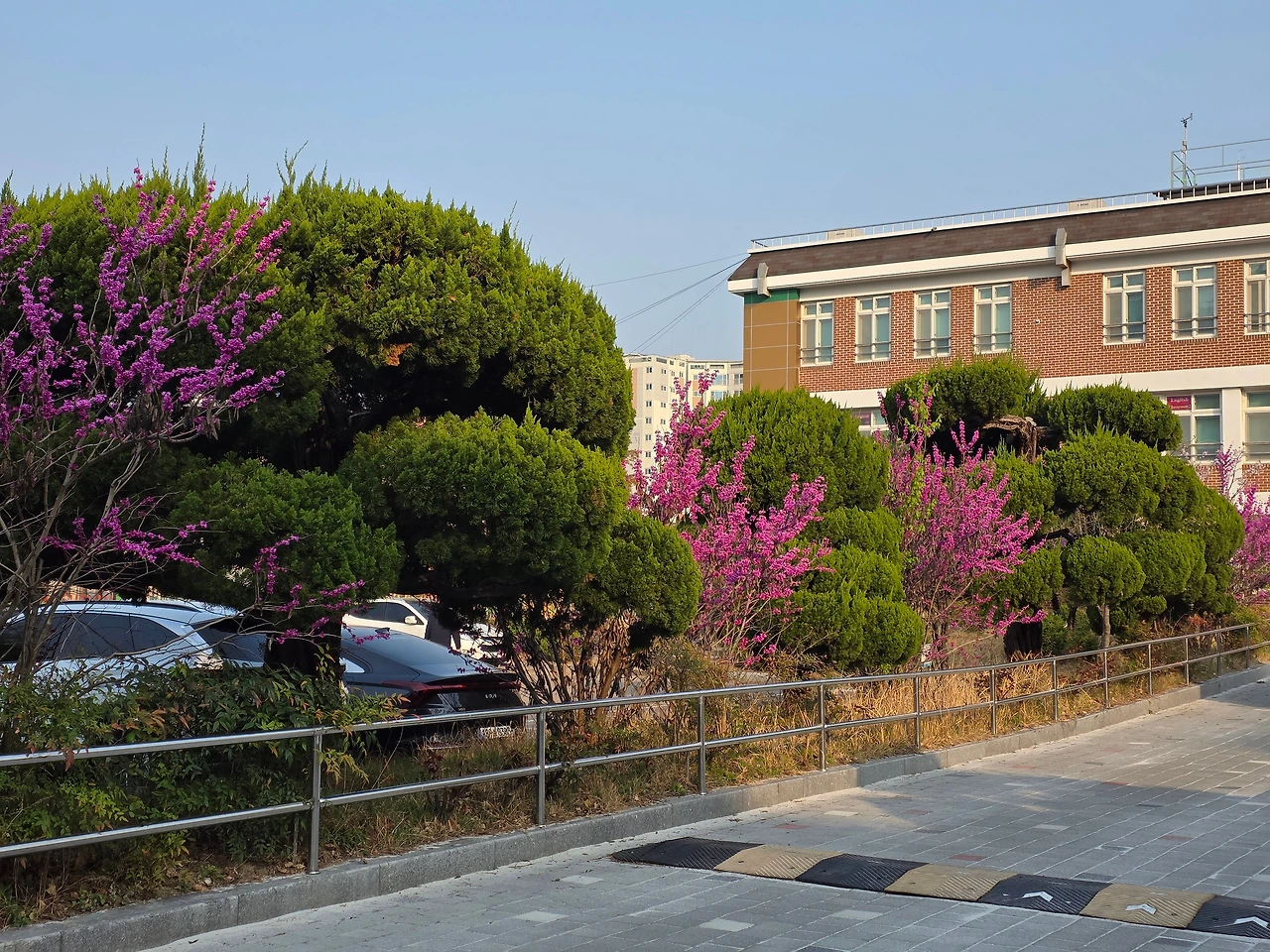 지원서를 내고 건물 바깥으로 나올 무렵에 줄기 전체에 불붙은 것처럼 타오르는 홍자색 박태기나무를 보았습니다. 지구 기온이 오르는 기후 위기가 심각해서일까요. 아무리 그래도 3월 초, 중순에 온몸에 벌겋게 달아오르도록 만개한 박태기나무를 보는 일은 반가움과 걱정이 교차하는 일이었습니다. 학교지킴이 선생님께 조심스럽게 여쭈어 보았습니다.