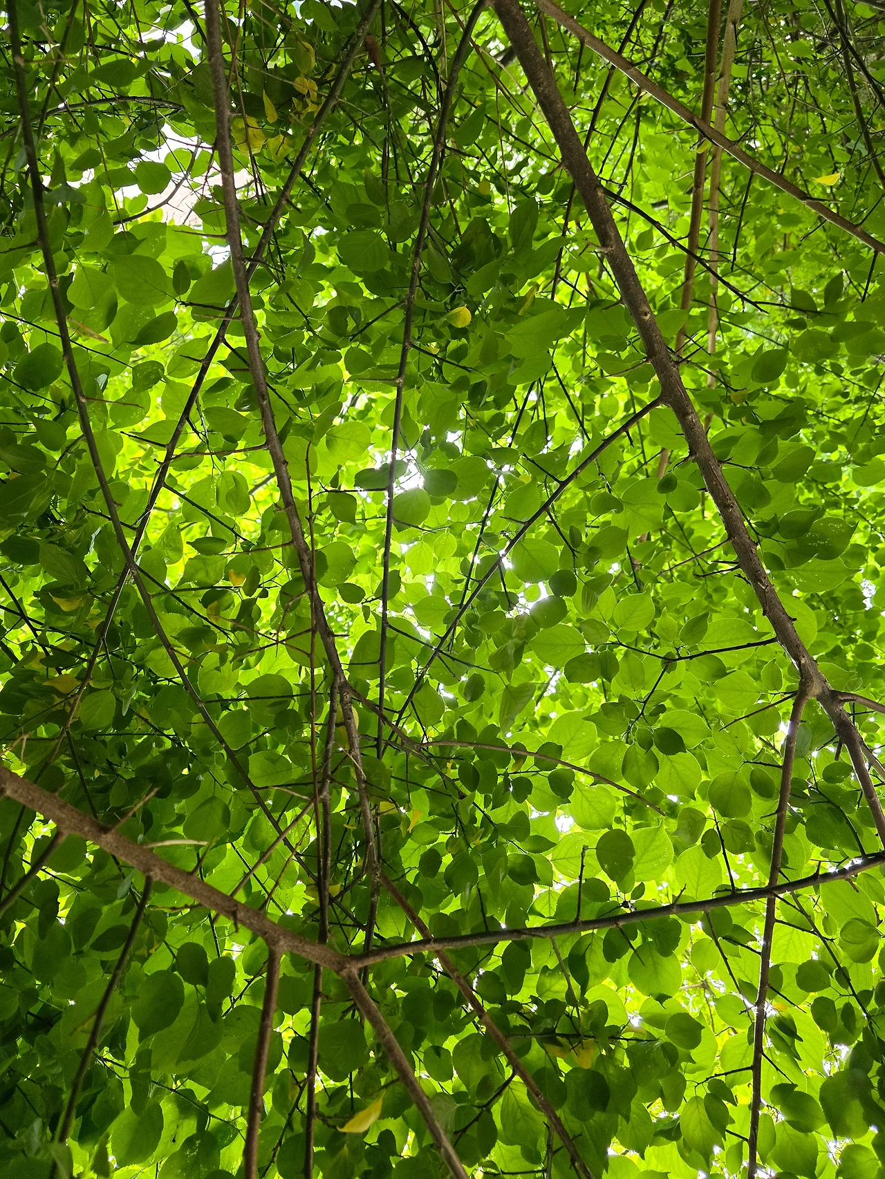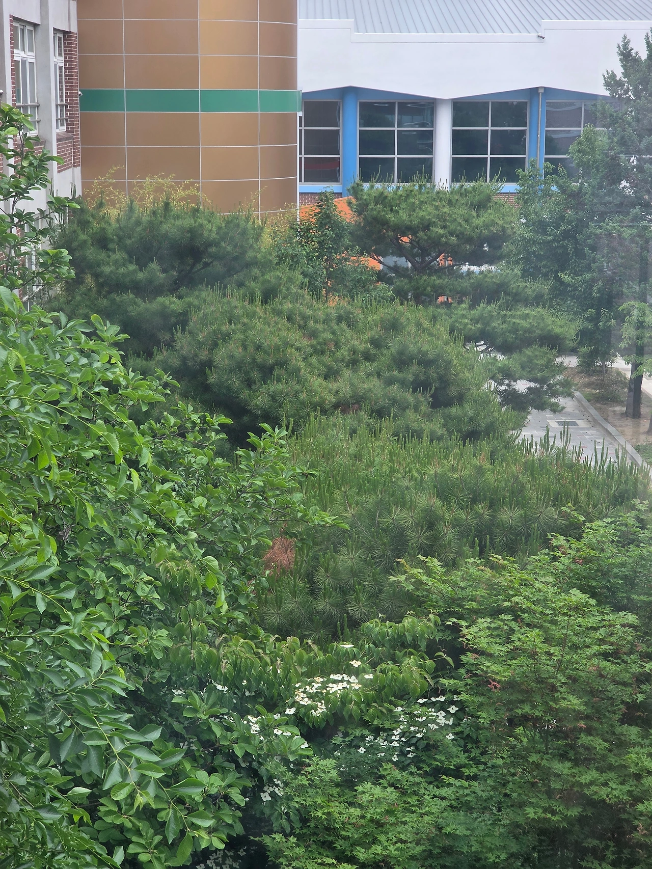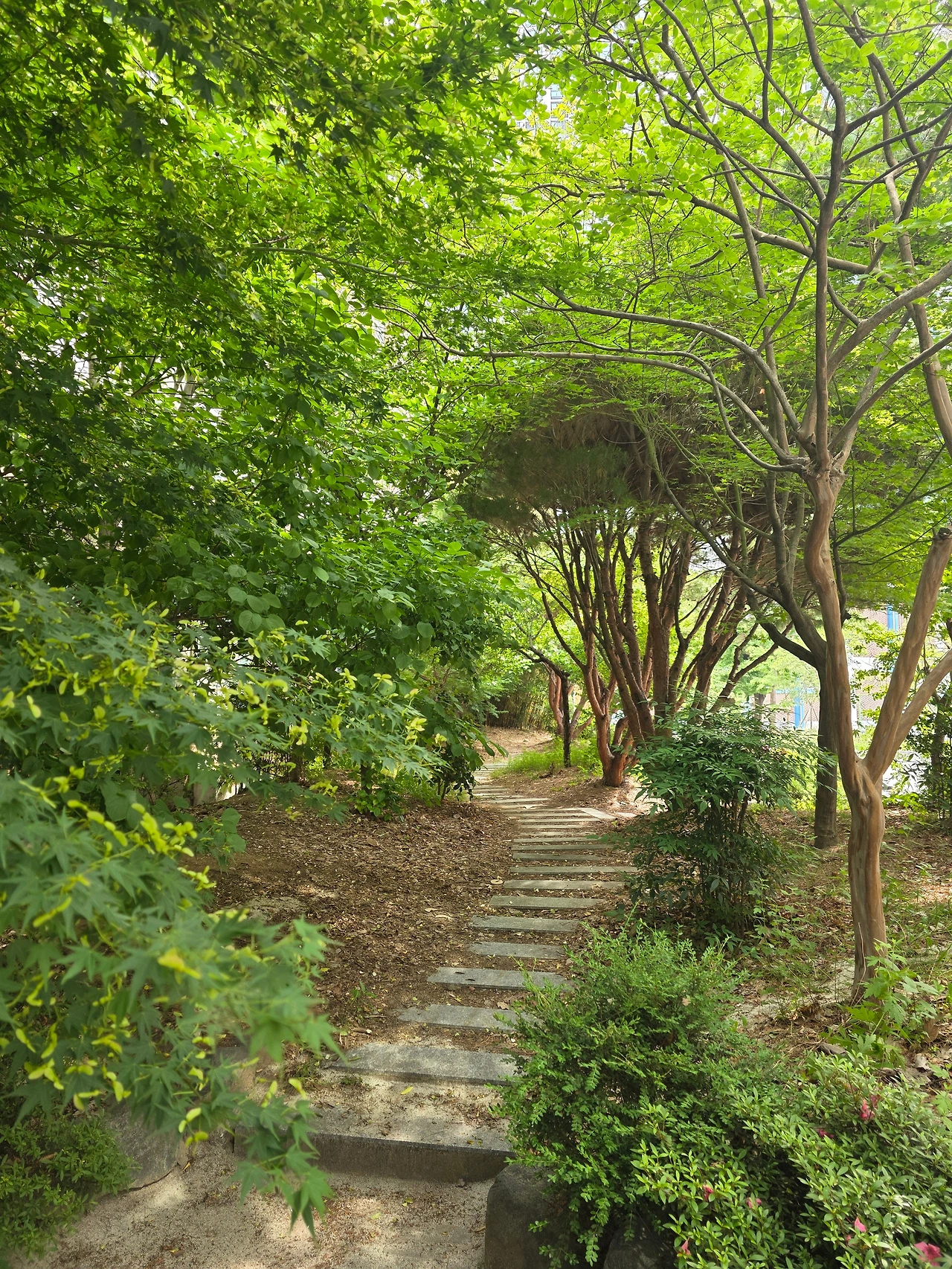 그 아이들 노는 다른 한편에는 오솔길 그늘 속에서 개미를 찾아 노는 아이가 있습니다. 들어가 볼까 생각했던 그 오솔길을 오늘은 저도 들어가 봅니다. 단풍나무가 씨앗을 키우고 있고 커다란 반송나무는 자신의 잎들이 아래의 잎들을 가려 빛이 차단된 가지들은 누래져 있습니다. 몸을 돌멩이처럼 웅크려 앉아 하늘을 보면 가려진 하늘 아래 나뭇잎 천지의 새로운 세상이 펼쳐져 있습니다. 어른의 몸집인 제가 쪼그마한 오솔길을 빠져나가려 할 때 하늘 위에서 나비 같고 꽃 같은 흰 무늬들이 저를 붙잡습니다. 하늘을 가린 푸른 잎보다 더 위에 있어 그저 짐작만 할 뿐입니다. 혹시 산딸나무?