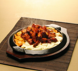 직화로 맵게 볶아낸 닭고기를 동그란 철판에 담아서 나오는데, 매운맛을 중화시키기 위해 계란찜 또는 누룽지탕이랑 같이 먹곤 했었다.