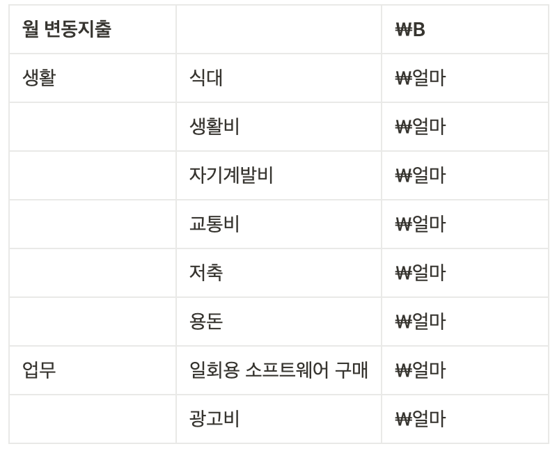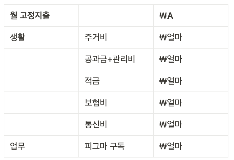 구체적인 기준은 나만의 견적서를 만들면서 세우게 됐다. 나는 필요한 만큼만 일하자고 생각했고, 거기서 좀 더 벌면 여유가 생겨서 좋겠다고 판단했다. 내가 필요한 게 대체 뭔지 구체화하는 게 참 어려웠다. 그래서 첫 번째로는 가장 현실적인 ‘지출’에 초점을 두기로 했다. 우선 나의 월 고정지출과 변동지출을 정리하기 시작했다.