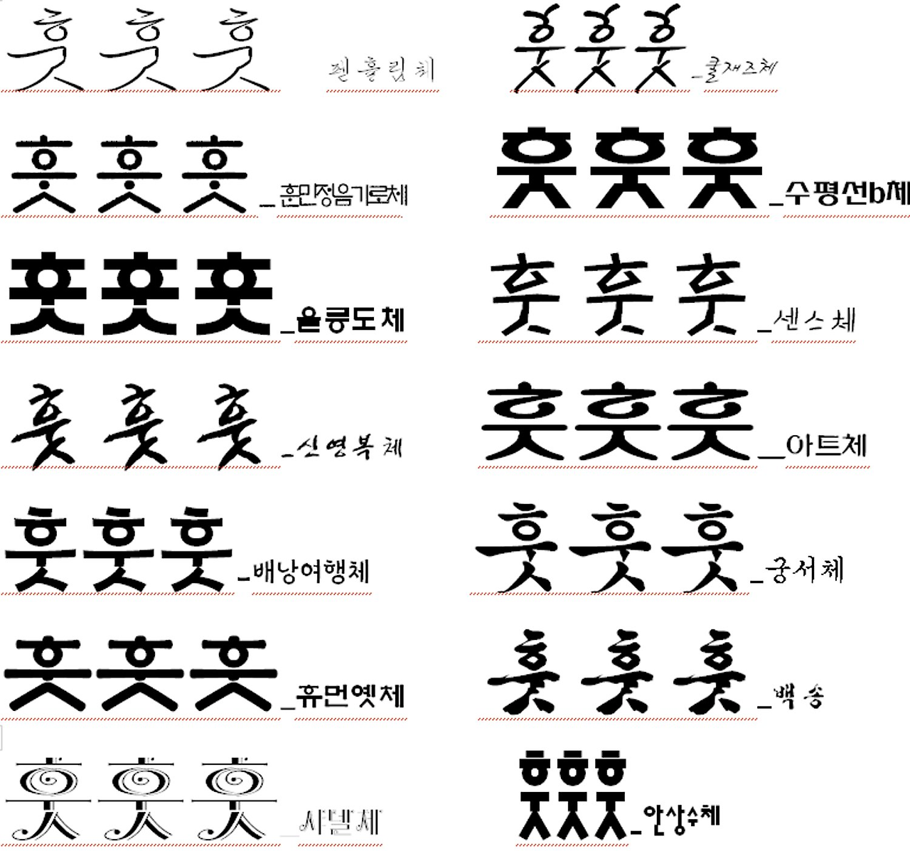 가령 이런 겁니다. '쿨재즈체'는 마치 사람이 모자를 삐뚤 하게 쓰고 재즈음악에 맞춰 춤을 추고 있는 듯하고, '센스체'는 뭔가 센스가 넘치는 사람이 멋을 부린 듯도 하고, '아트체'는 예술가가 멋들어진 모자를 쓰고 가르마 헤어스타일을 하고 있는 듯도 하고요. '휴먼옛체'는 선비가 갓을 쓰고 있는 듯도 하고, '배낭여행체'는 여행의 즐거움을 보여주듯 룰루랄라 뛰는 듯도 하고요...(개인적인 느낌입니다..) 어떠신가요?