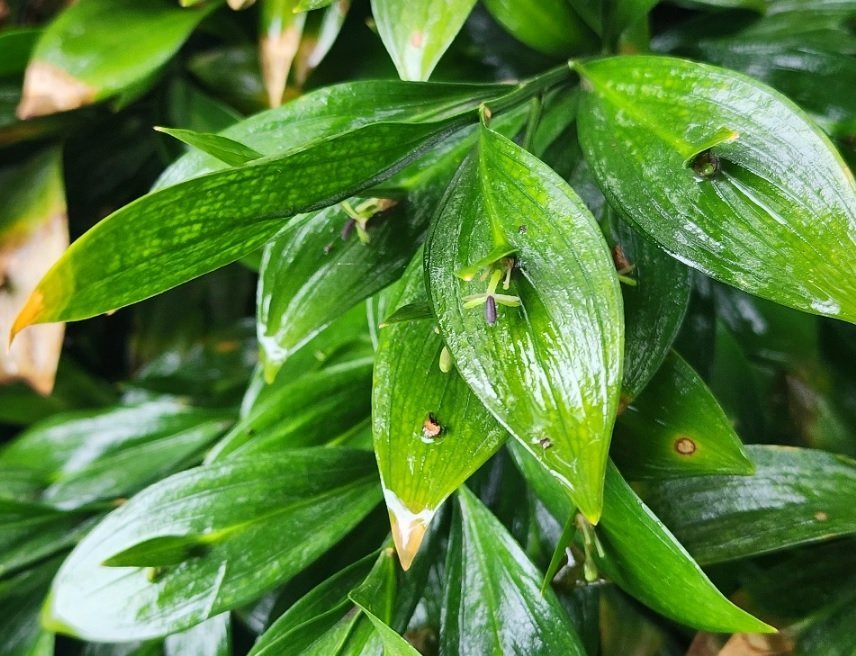 얼마 전 ‘루스커스’('크리스마스 베리'라는 이름으로 더 알려져 있네요.)라는 식물을 알게 됐습니다. 평범한 잎 한가운데에 똑같이 생긴 또 하나의 작은 잎이 돋아나는 식물인데요. 더욱 신기한 것은 (줄기가 변형된) 그 잎에서 아주 작은 꽃이 피어닌다는 사실입니다. 그런데 그 꽃은 마치 (사진에서 보시는 것처럼) 지붕 같은 잎 아래에 숨어 있고 크기가 아주 작아서 몸을 숙이고 관심 있게 보거나 쪼그려 앉지 않으면 발견할 수 없다고 하네요.