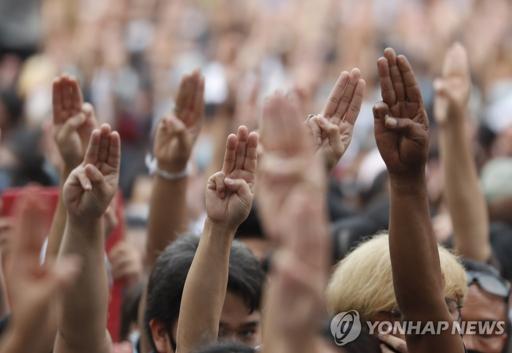 태국 민주화운동의 상징이 된 '세 손가락 경례' (ⓒ연합뉴스), 영화 헝거게임에서 따왔다고 한다.