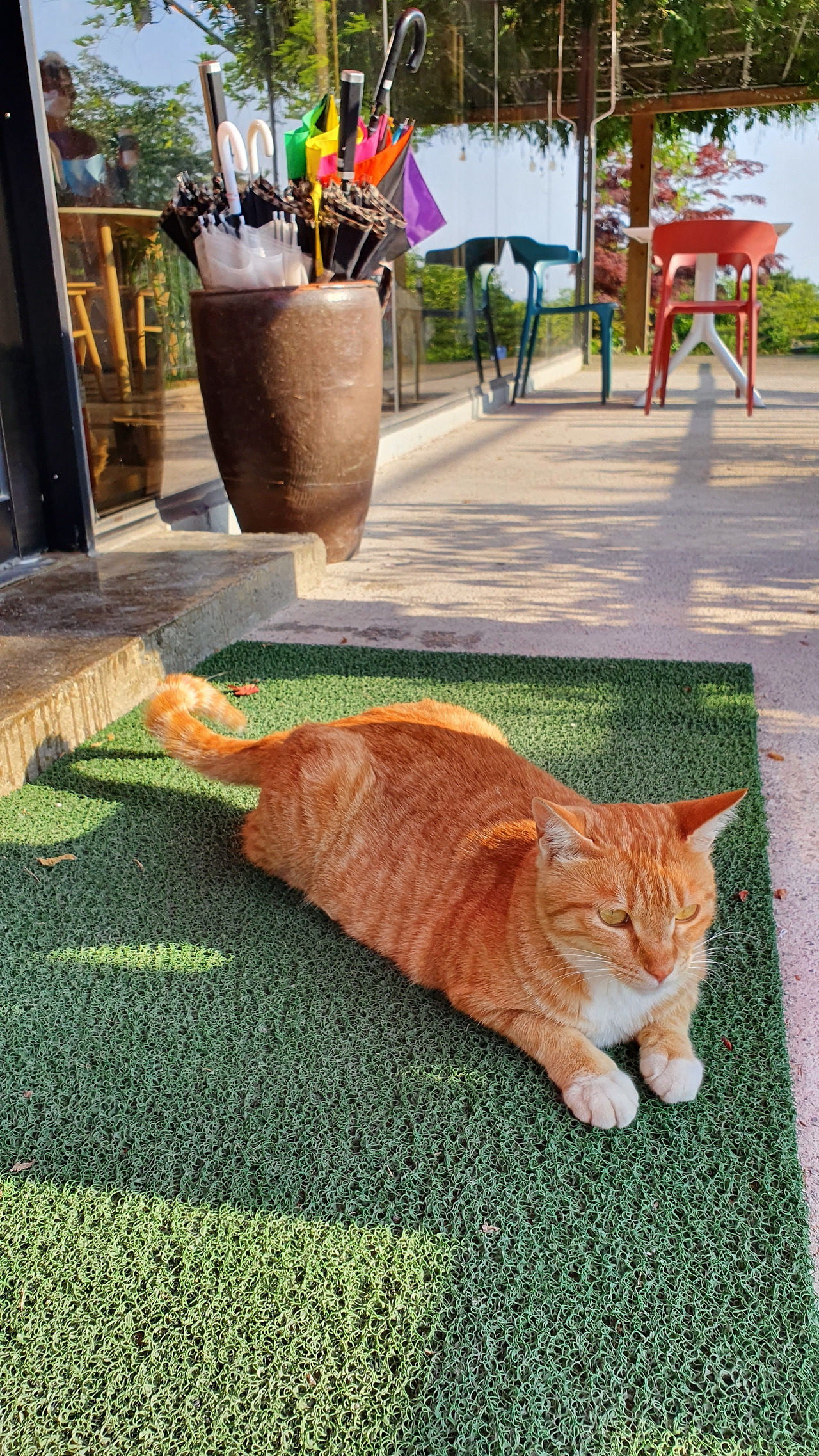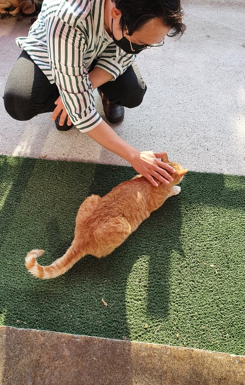 그렇게 만난 노란 고양이는 막 깨어나서 그런가 온순하고 멍했다. 호의를 베푸신 여사장님께 뭐라도 보여드려야 할 것 같아서 눈 딱 감고 황갈색 등을 쓰다듬었다. 헐, 생각보다 엄청 보드랍고 따뜻하다. 두 번, 세 번 계속 쓰다듬는데 처음 만난 내 손길에도 놀라지 않고 가만히 있는다. 내가 제 주인도 아닌데 부르면 쳐다보고 쫓아오기도 한다. 몇 년 기른 강아지에 버금가는 영특함과 붙임성이 아닐 수 없다. 관심 없는 듯 저 멀리 갔다가도 "우리 간다~"라고 인사하면 어느샌가 달려와 꼬리를 종아리에 살랑댄다. 밀당을 잘한다.