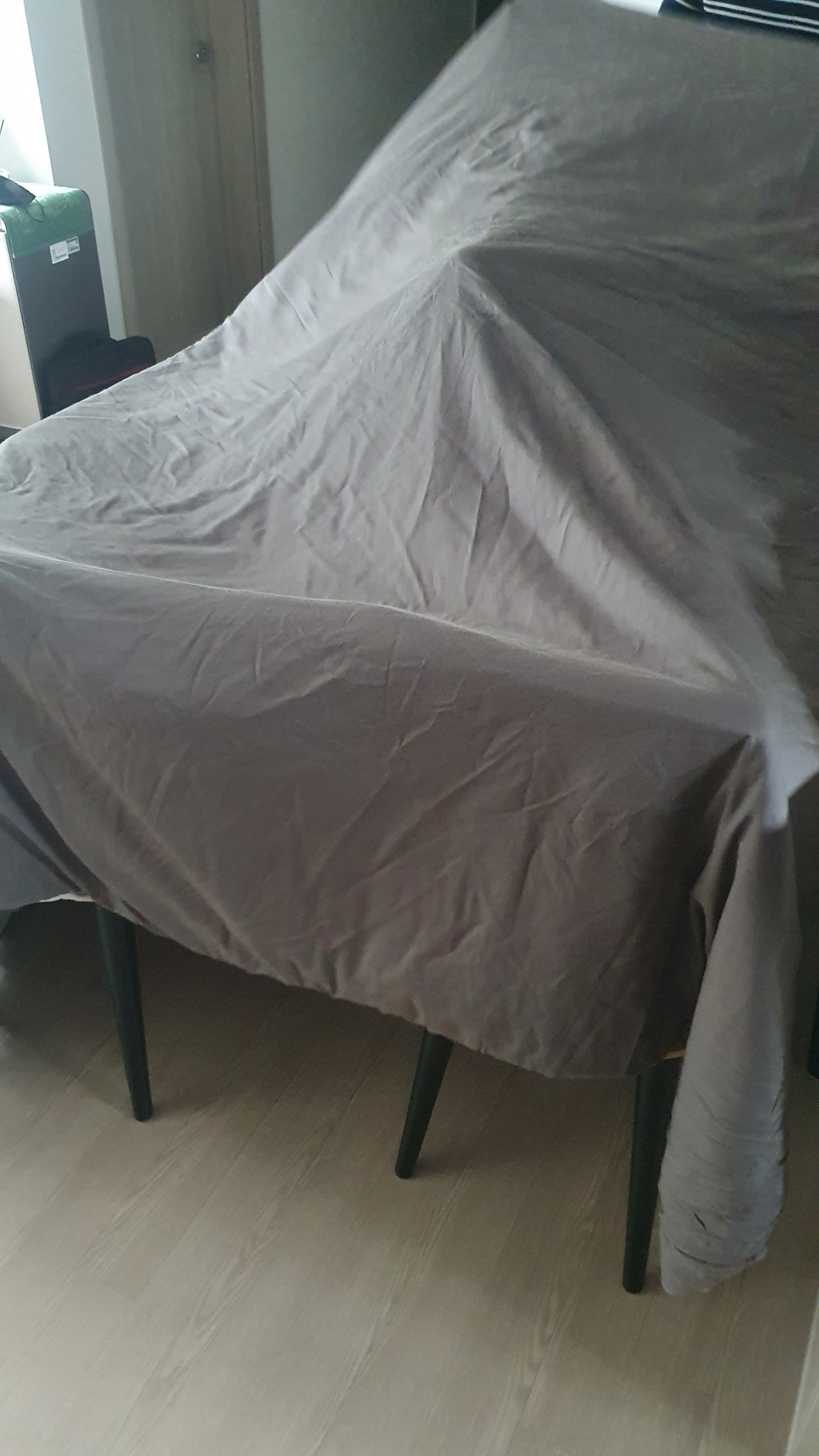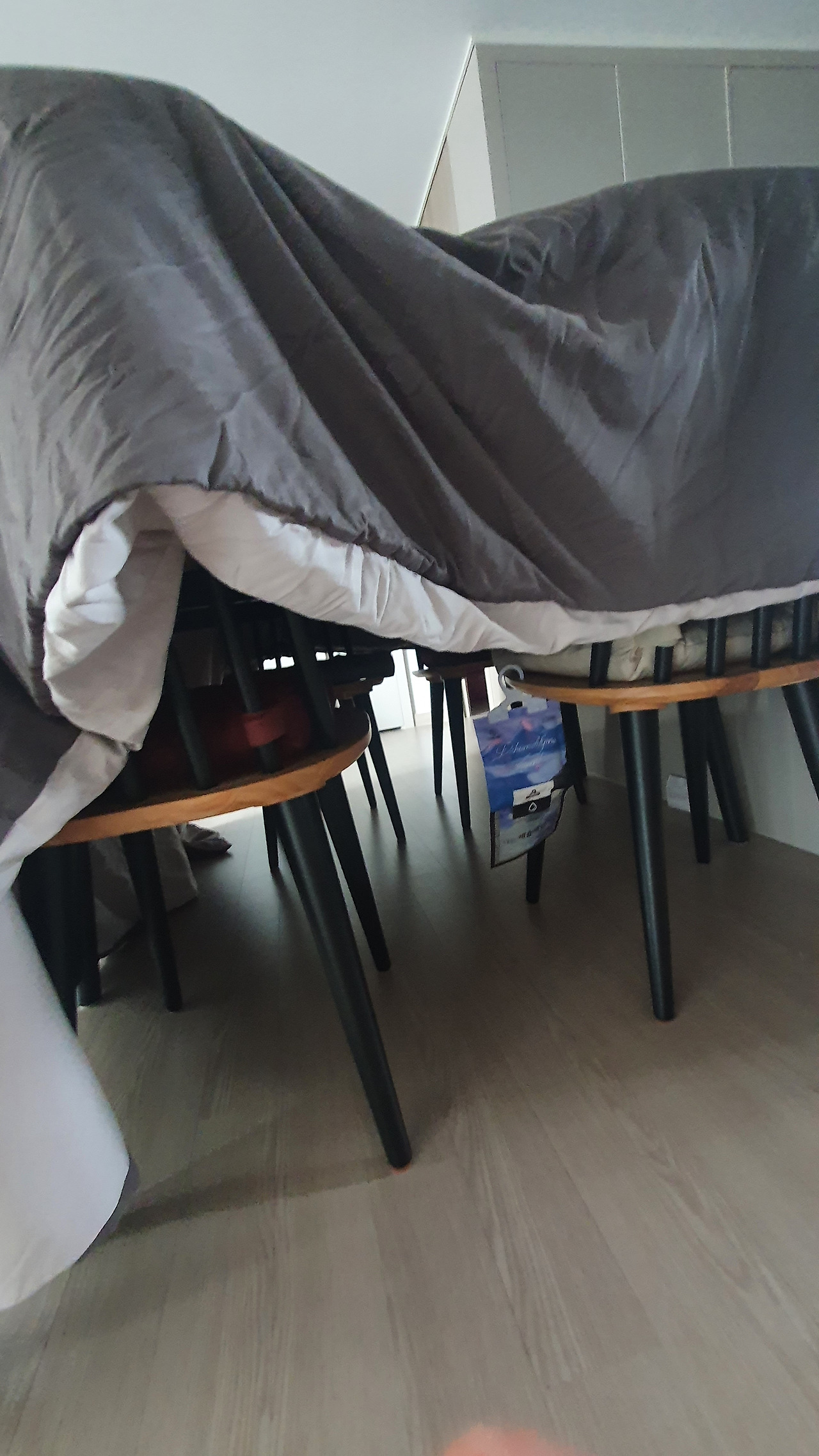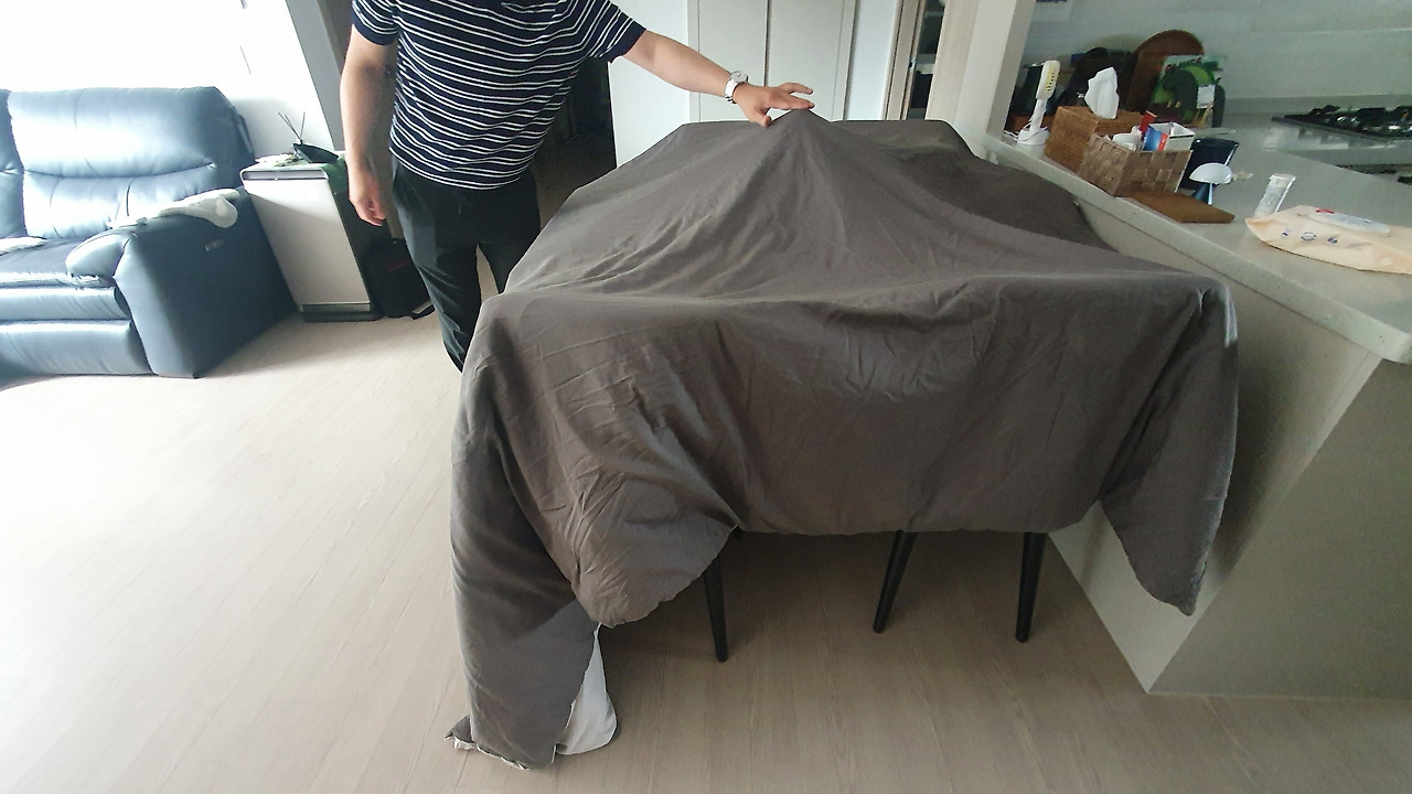 평소처럼 살짝 덜 마른 이불을 소파에 널어두었더니 남편이 질색팔색을하는 게 아닌가. 이러면 절대 안 마른다며 다급히 걷어낸다. 식탁에 다시 널기 시작한다.