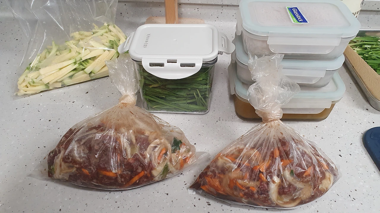 이제 가장 중요한 남편의 비상식량 만들기. 어젯밤 자기 전 해동해 놓은 불고기거리를 양념에 재운다. 남편은 불고기에 부추 올려 먹는 걸 좋아하는데 먹기 직전 넣어야 식감이 살아있을 테니 손질만 해서 냉장고에 넣어둔다. 카레와 밥은 소분하여 얼린다. 고구마와 과일은 일부러 보일만한 곳에 잔뜩 가져다 놓는다.