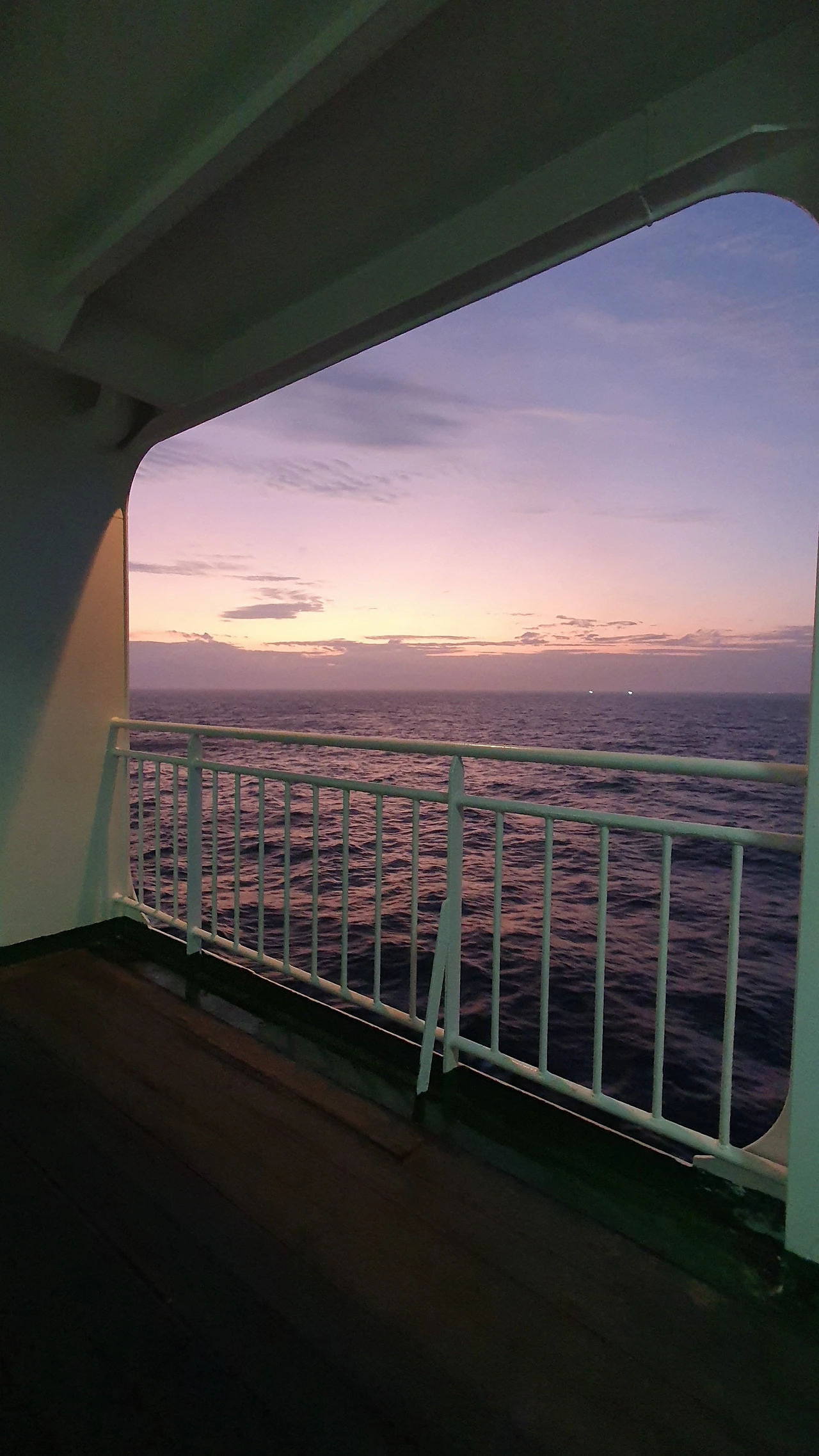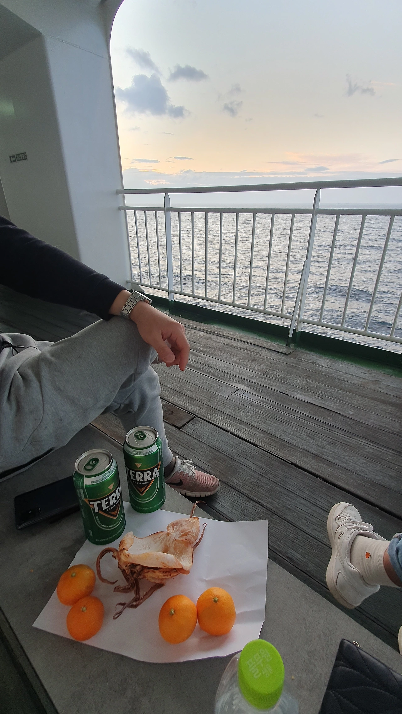 알찬 며칠을 뒤로하고어느새 다시 제주항에 도착했다. 이번엔 일찌감치 벽 쪽 자리를 맡아등을 기댔고 여유로이 귤까지 까먹었다. 역시 사람은 경험을 해야 한다며 의기양양하기도 잠시, 갑판에나가보니 플라스틱 의자를 깔고 육지에서 사 온 피자, 치킨을 드시는 찐고수들이계셨다.